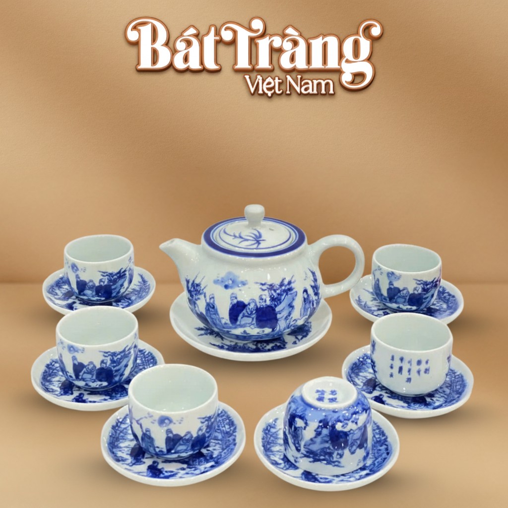Trong dòng chảy bất tận của gốm sứ Việt, Gốm Bát Tràng luôn giữ vững vị thế là cái nôi của những tuyệt tác thủ công. Bộ ấm chén Trúc Lâm Thất Hiền này là một minh chứng hùng hồn cho di sản ấy. Nước men lamtruyền thống, với sắc xanh cổ điển, tạo nên phông nền hoàn hảo cho họa tiết Trúc Lâm Thất Hiền được vẽ tay tỉ mỉ. Họa tiết này là một câu chuyện được thể hiện qua hình ảnh, gợi nhắc về sự thanh cao, an nhiên của bảy danh sĩ ẩn mình giữa rừng trúc, biểu trưng cho trí tuệ và khí tiết.