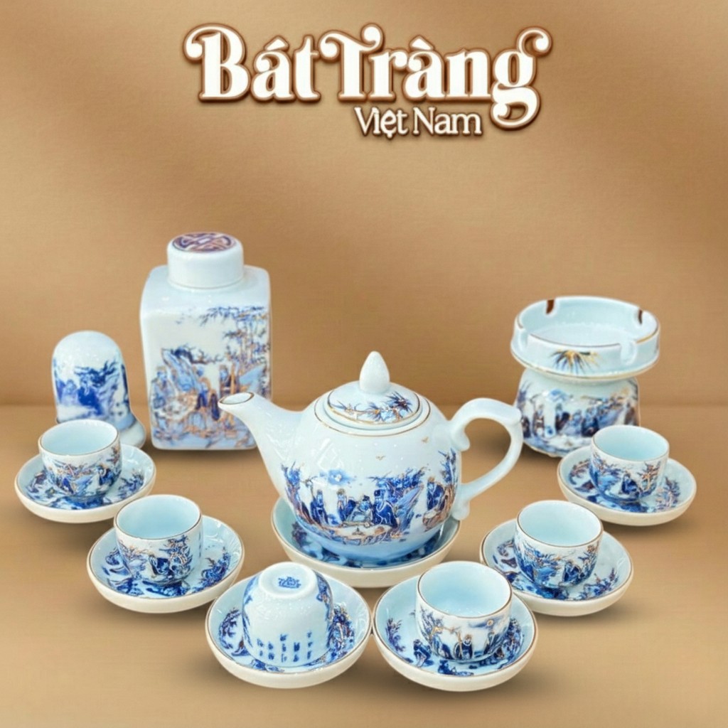 Điểm nhấn của bộ trà cụ nằm ở sự kết hợp giữa vẻ đẹp trầm mặc của men lam truyền thống và sự lộng lẫy của vàng kim hiện đại. Sắc men lam Bát Tràng xanh sâu thẳm được các nghệ nhân chế tác trên nền sứ trắng tinh khôi, tạo nên độ tương phản sắc nét nhưng vẫn giữ được nét thanh nhã tựa như những bức tranh thủy mặc xưa.