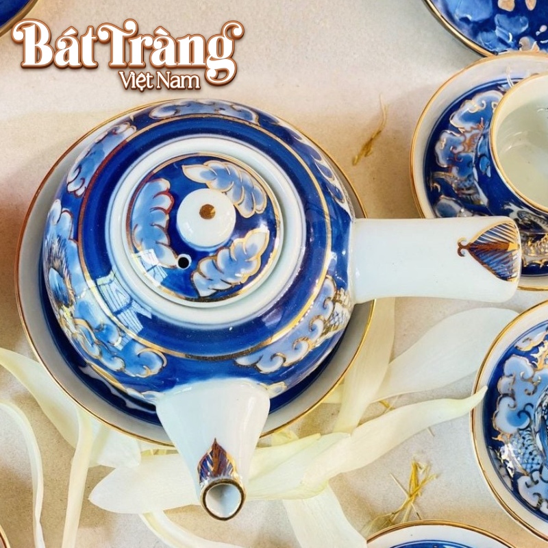 Linh hồn của bộ ấm chén trà Bát Tràng này nằm ở sắc men lam trứ danh – dòng men cổ xưa nhất của gốm sứ Bát Tràng. Sắc xanh coban trầm mặc, sâu lắng lan tỏa trên nền sứ trắng tạo nên chiều sâu hun hút, tựa như sắc màu của trời và biển hòa quyện. Lớp men bóng mịn, sáng trong bao phủ bên ngoài giúp bảo vệ cốt gốm trường tồn cùng thời gian.
