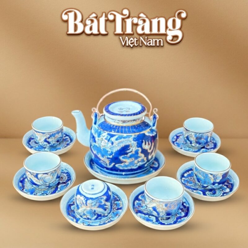 Họa tiết Long Ẩn được nghệ nhân phác họa thủ công dưới lớp men, tái hiện sinh động hình ảnh rồng thiêng ẩn hiện trong mây sóng. Trong văn hóa phương Đông, rồng là biểu tượng của quyền uy, sức mạnh và sự bảo hộ, mang lại vượng khí và may mắn cho gia chủ. Những nét vẽ lam sắc uyển chuyển phối cùng ánh vàng kim kiến tạo nên một bức tranh phong thủy giàu tính nghệ thuật ngay trên bàn trà.