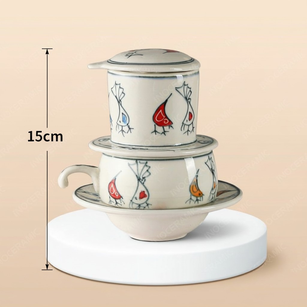 Mỗi chi tiết trên Bộ Phin Cà Phê Gốm Sứ Bát Tràng đều được những nghệ nhân làng nghề Bát Tràng vẽ tay tỉ mỉ. Họa tiết chim cá cách điệu, sống động trên nền men trắng ngà không chỉ là điểm nhấn nghệ thuật độc đáo mà còn gợi nhắc về những giá trị văn hóa truyền thống, mang đến cảm giác vui tươi, mộc mạc và gần gũi. Đây là một tác phẩm nghệ thuật nhỏ, tô điểm cho không gian sống và bàn làm việc của bạn.