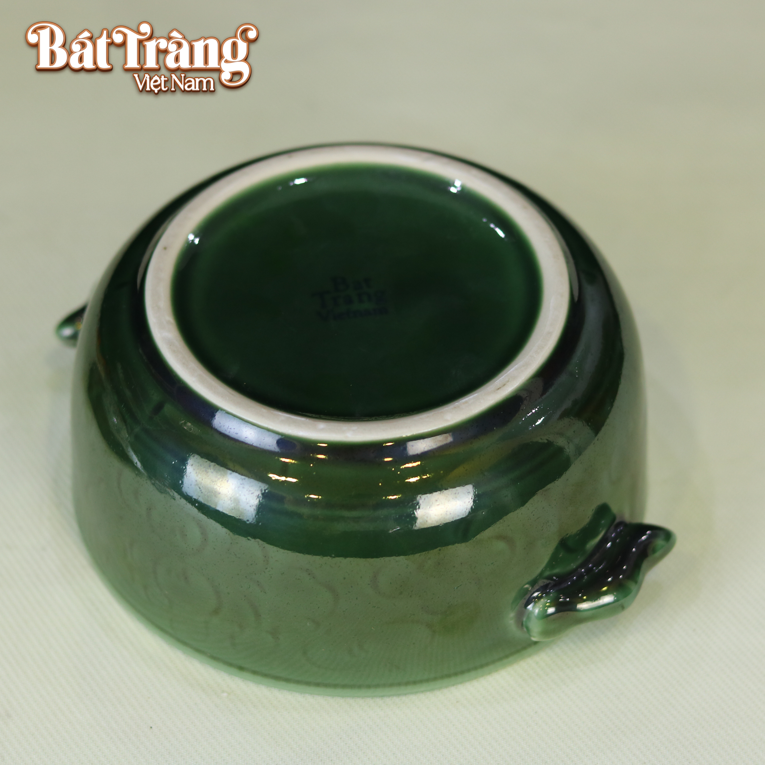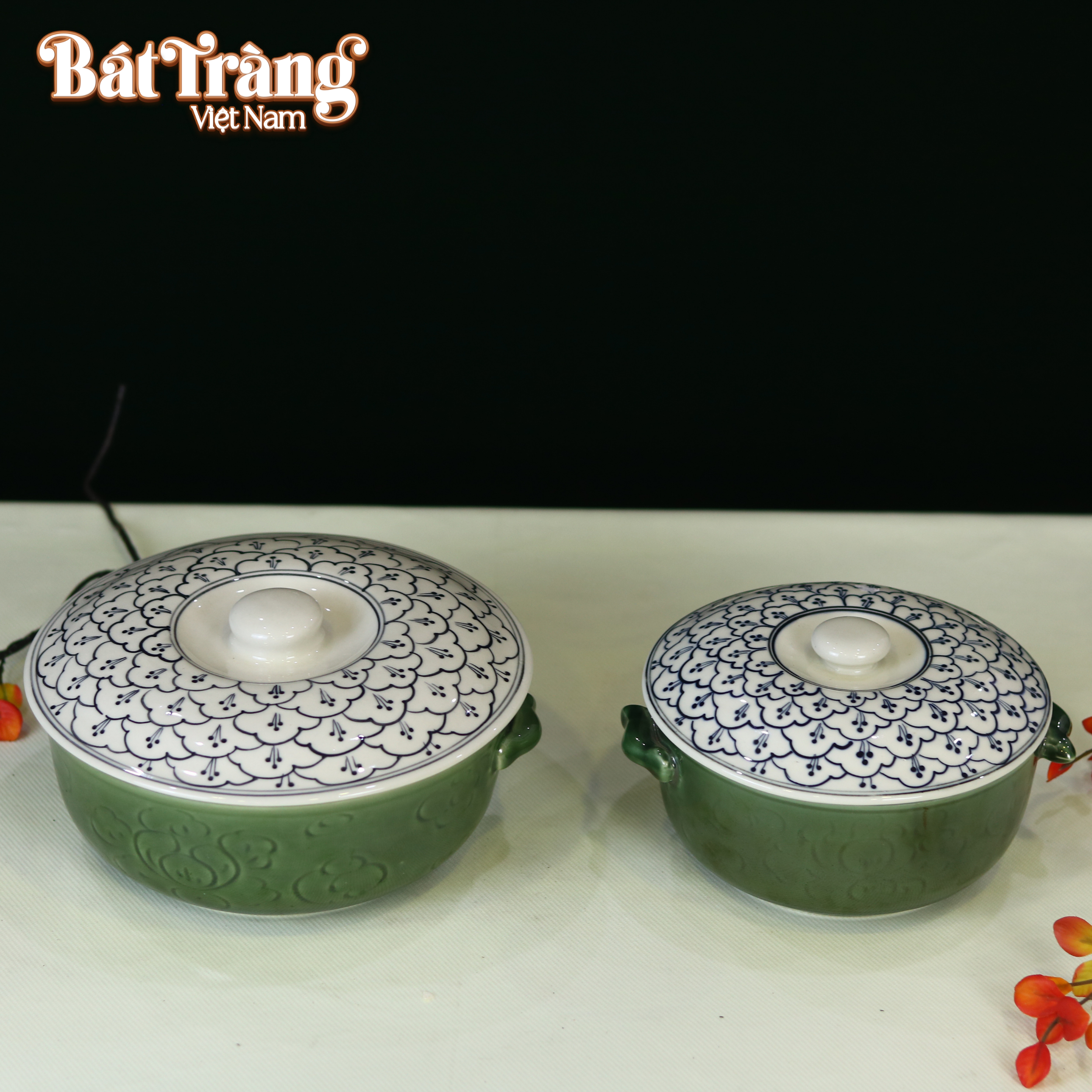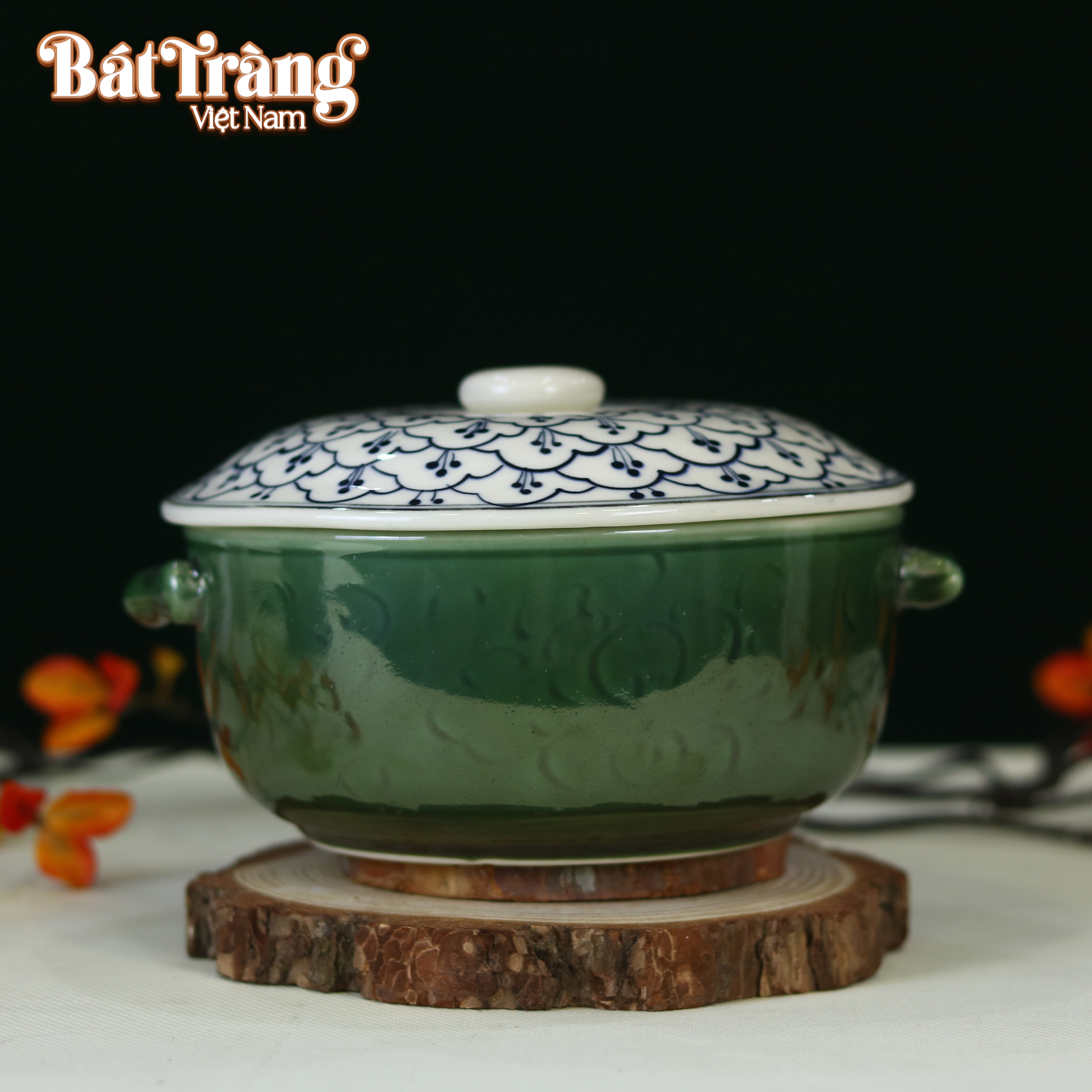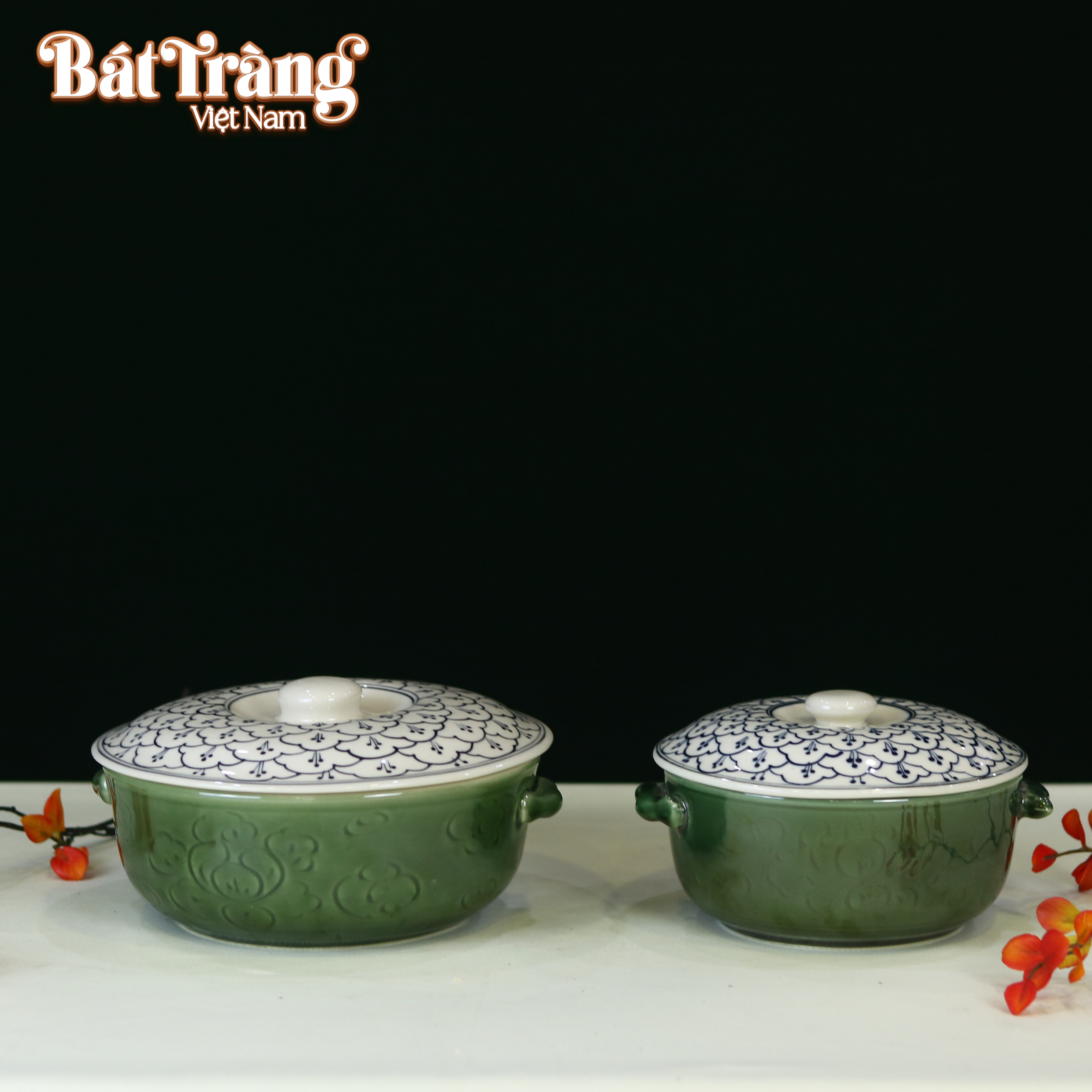 Thân tô không chỉ đơn thuần là men ngọc mà còn được tô điểm bằng những hoa văn chìm nổi tinh tế, mang lại chiều sâu và sự phong phú cho tổng thể sản phẩm. Đôi quai cầm tiện lợi giúp việc di chuyển âu cơm dễ dàng hơn, đặc biệt khi món ăn còn nóng hổi. Khả năng giữ nhiệt tốt là một lợi thế không thể bỏ qua, giúp món canh, món hầm hay món kho luôn ấm nóng, trọn vị trên bàn ăn.