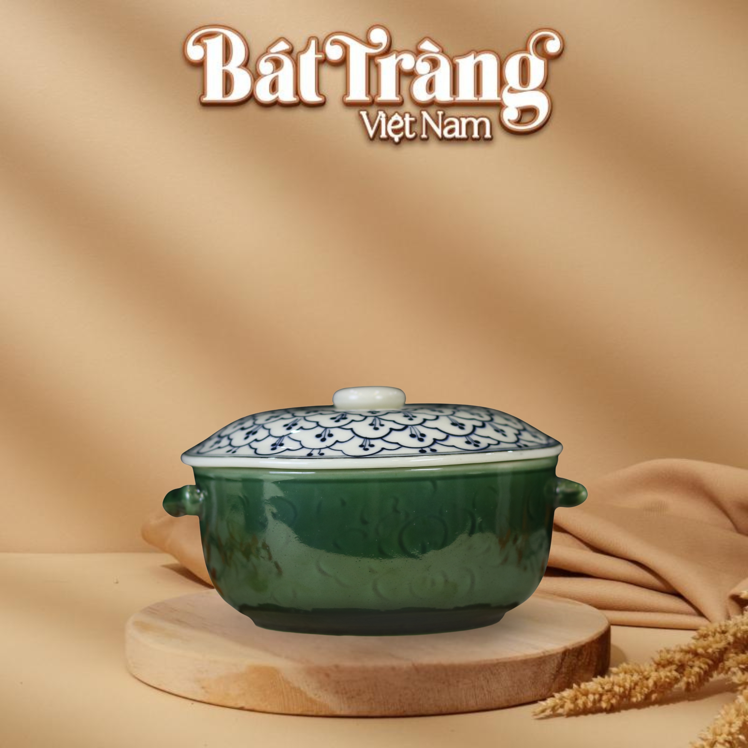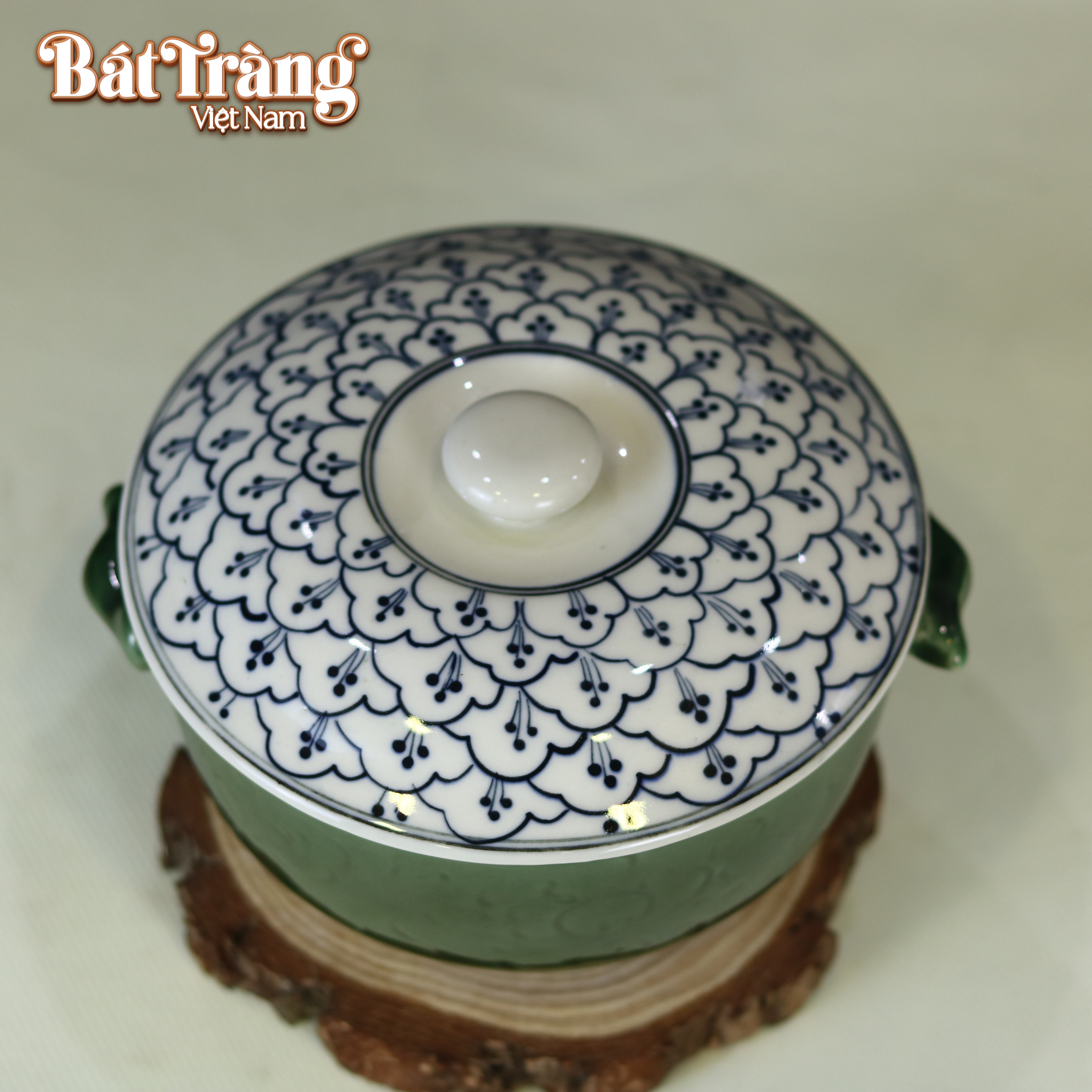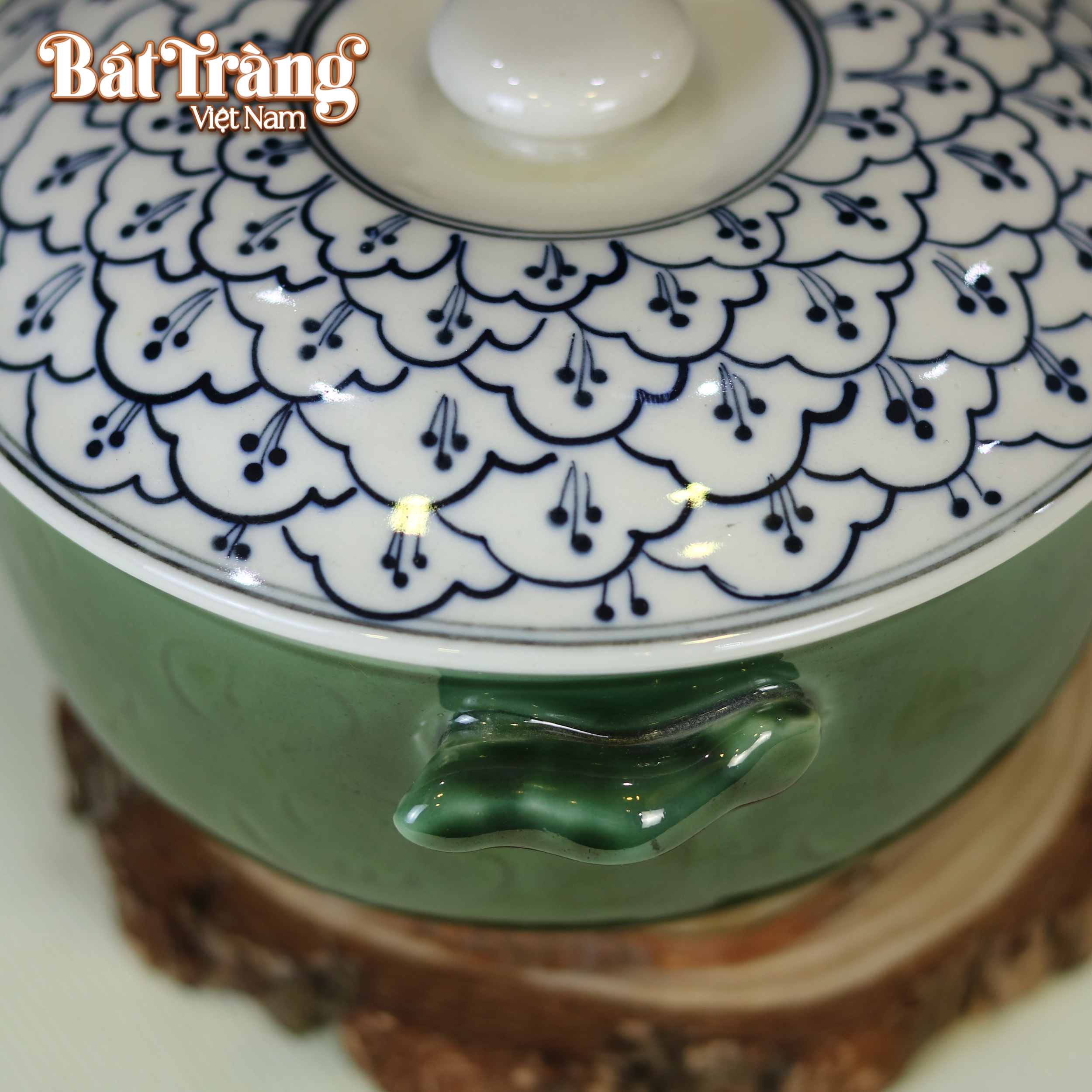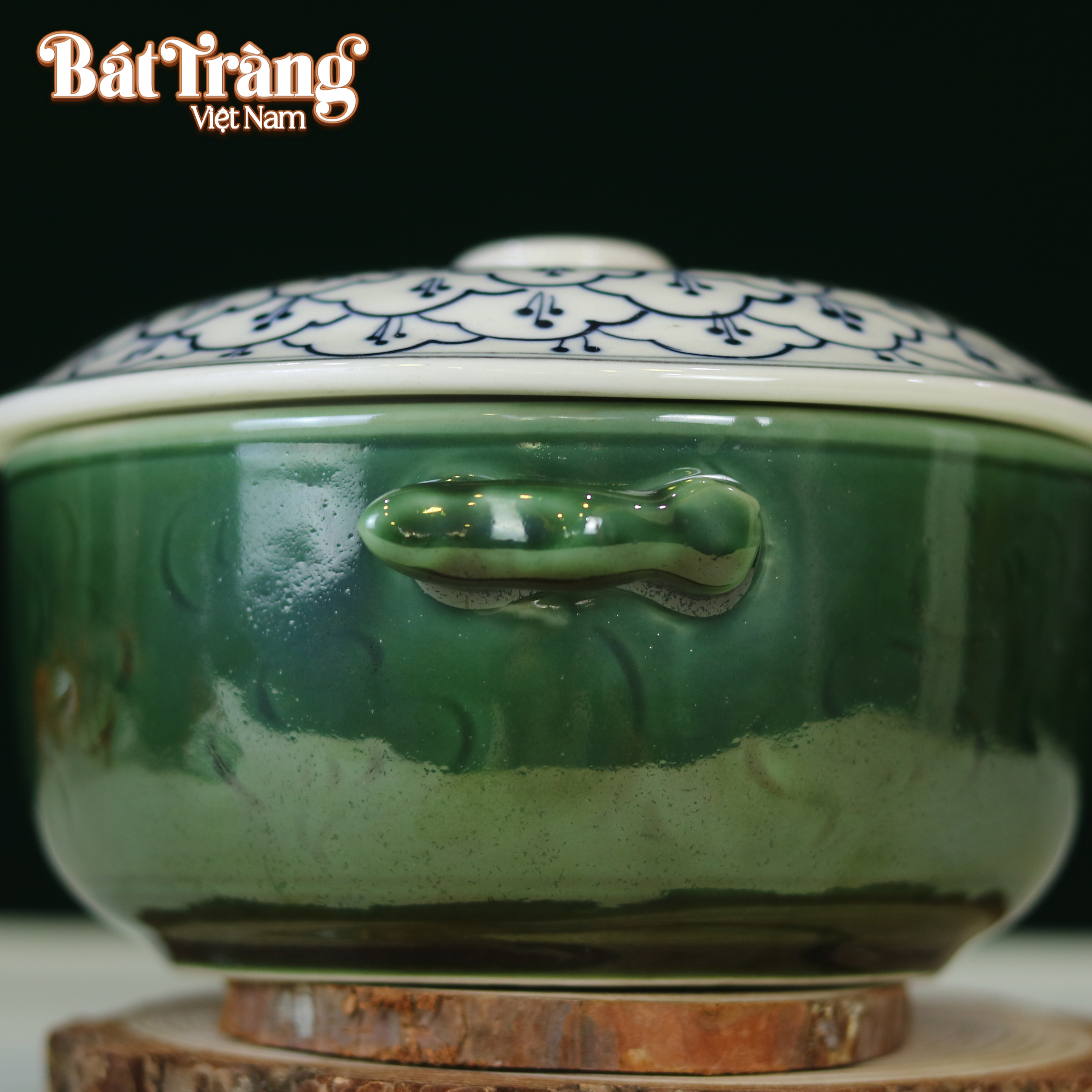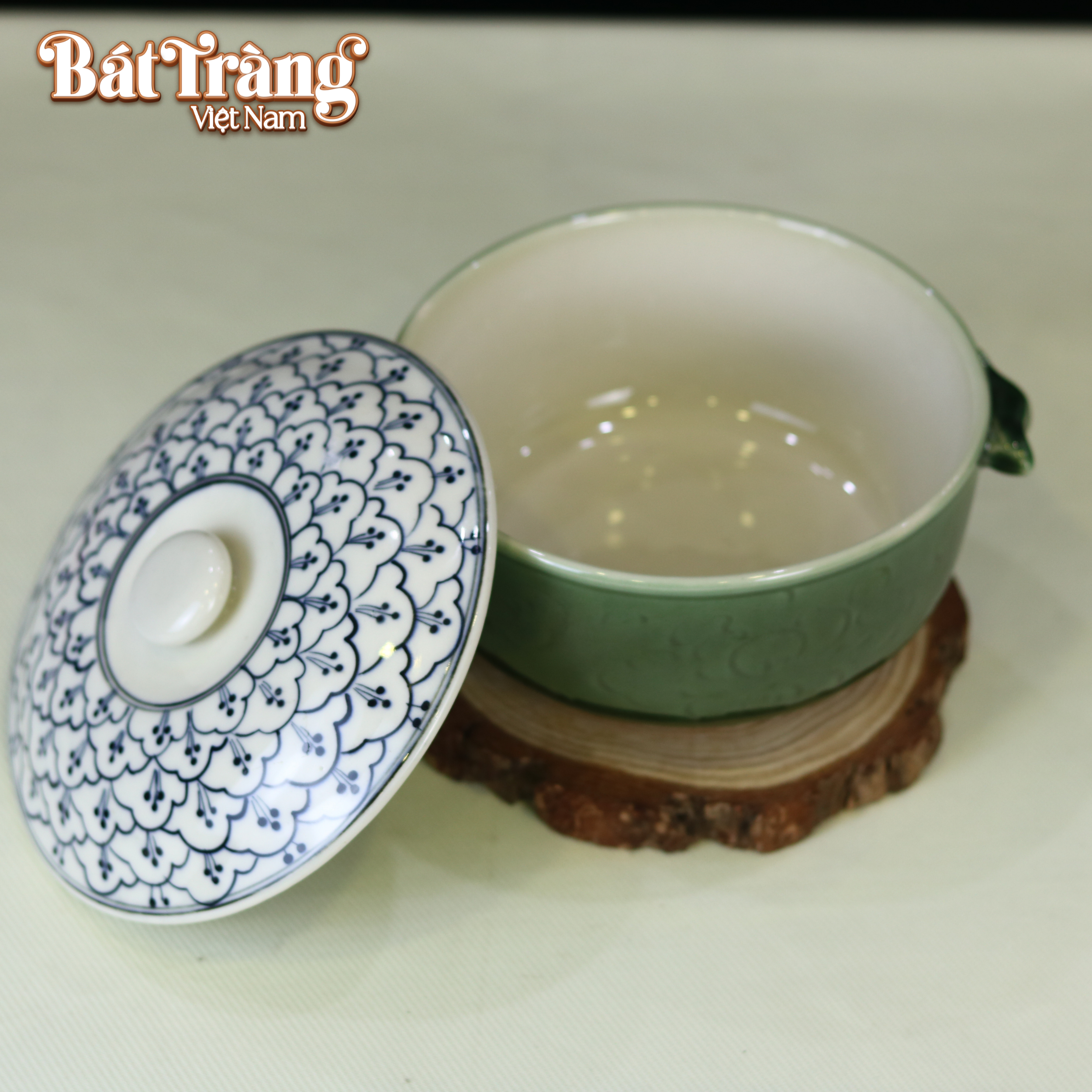 Sản phẩm được chế tác từ chất liệu gốm sứ Bát Tràng cao cấp, trải qua quá trình nung ở nhiệt độ cực cao, giúp loại bỏ hoàn toàn tạp chất độc hại, đảm bảo độ bền vượt trội và an toàn tuyệt đối cho sức khỏe người sử dụng. Màu men ngọc xanh lục bảo trên thân tô toát lên vẻ đẹp cổ điển, quý phái, trong khi nắp tô với men trắng vẽ lam họa tiết bèo xanh lại mang đến sự tươi mát, thanh lịch.