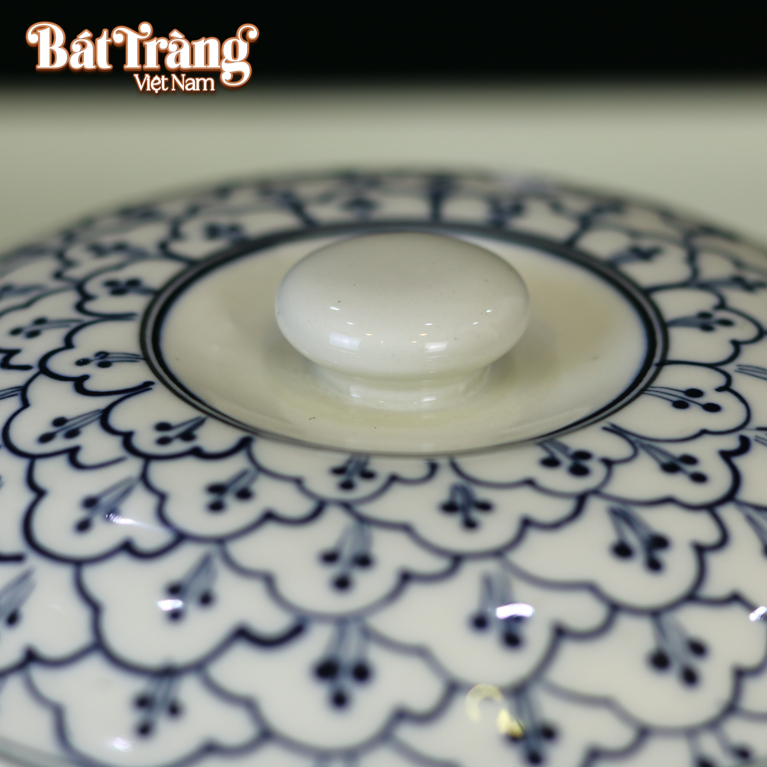 Thiết kế của âu cơm là sự giao thoa giữa tính thẩm mỹ và sự tiện dụng. Dáng tô tròn đầy đặn, miệng hơi loe nhẹ, tạo cảm giác thân thiện, dễ gần. Đặc biệt, nắp tô được điểm xuyết những họa tiết bèo xanh vẽ lam thủ công dưới men, tạo nên một vẻ đẹp sống động và độc đáo.