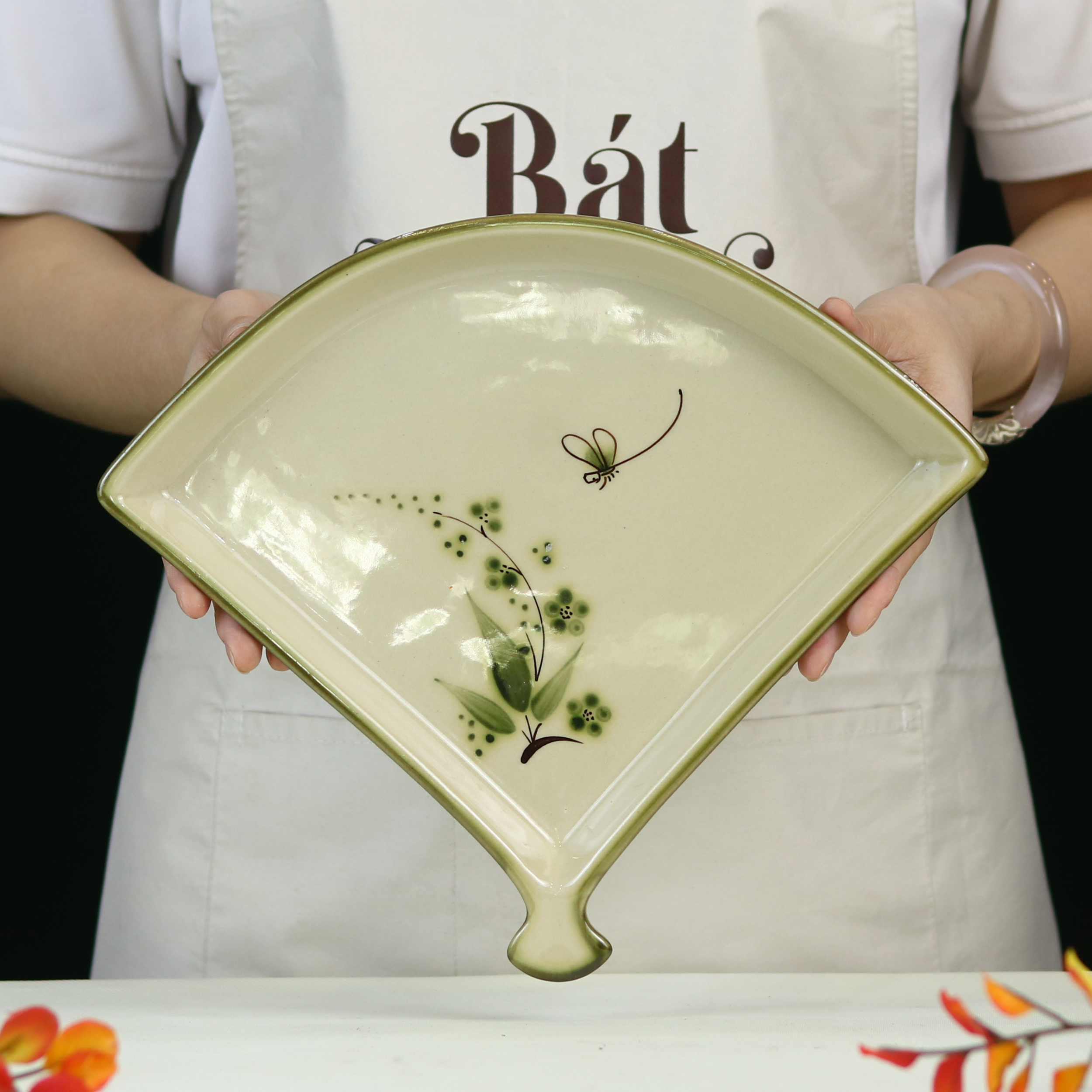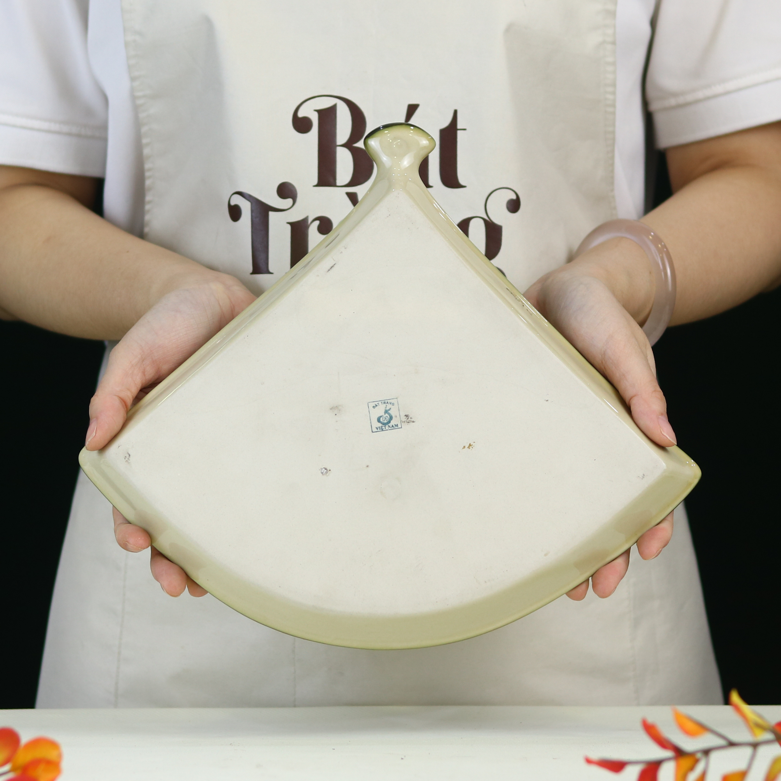 Là một mảnh ghép không thể thiếu trong các bộ bát đĩa hiện đại, chiếc đĩa này được chế tác từ gốm sứ Bát Tràng cao cấp, nổi bật với men kem bóng mịn màng cùng đường viền xanh lá cây tinh tế. Dáng đĩa hình tam giác cách điệu, độc đáo như một cánh quạt, tạo nên sự khác biệt và thu hút mọi ánh nhìn.