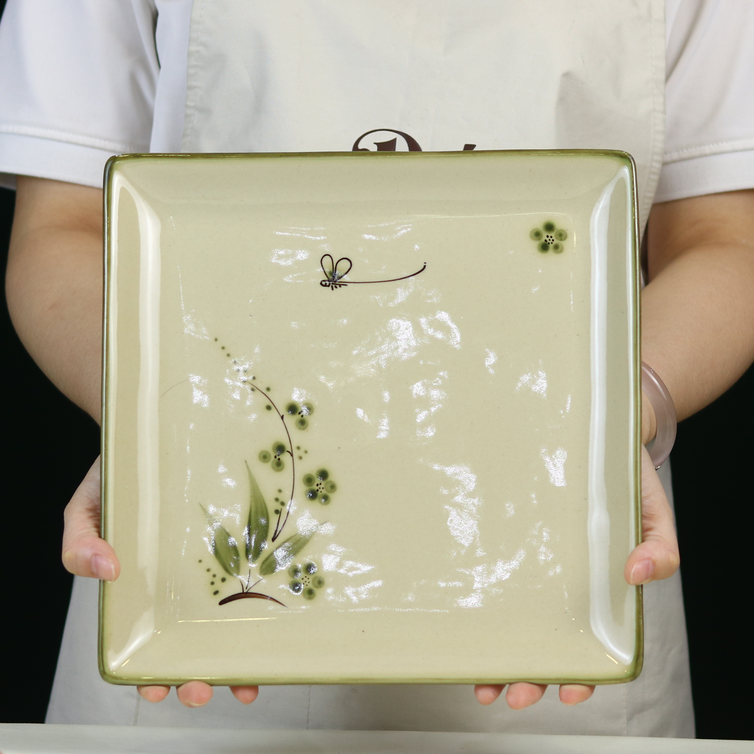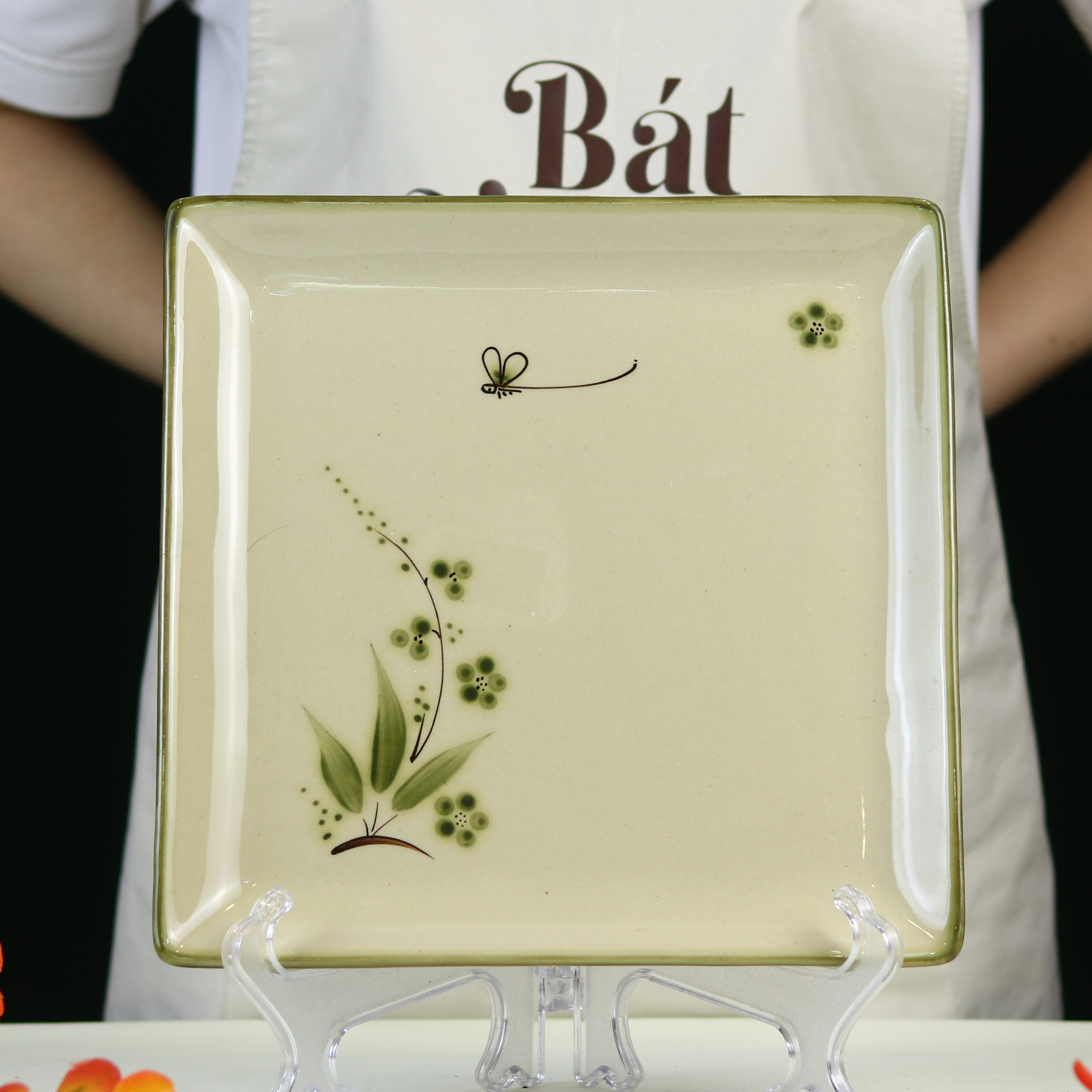 Mỗi chiếc đĩa vuông chuồn trúc đều mang trong mình một câu chuyện về sự yên ả và tươi mới. Họa tiết chuồn chuồn bay lượn trên cành lá xanh mướt, điểm xuyết những bông hoa chấm bi nhỏ xinh, được vẽ tay thủ công một cách tỉ mỉ. Đây là một chi tiết đắt giá, gợi lên cảm giác thư thái của một buổi chiều hè êm đềm, biến mỗi bữa ăn thành khoảnh khắc thưởng thức nghệ thuật.