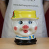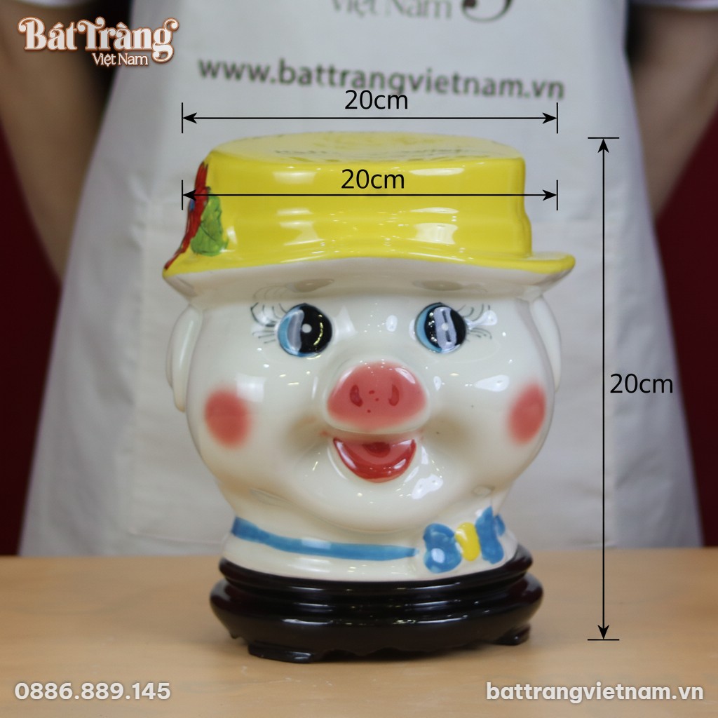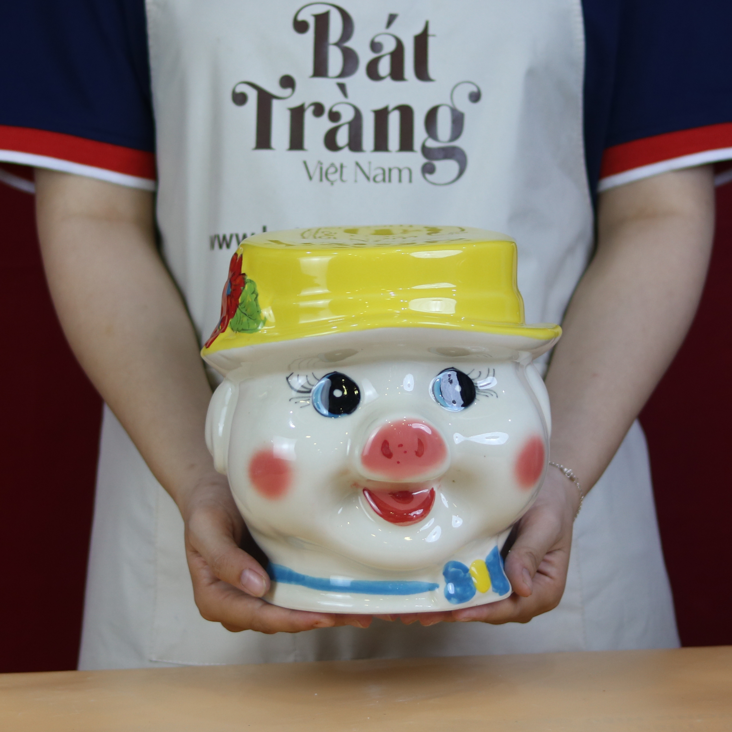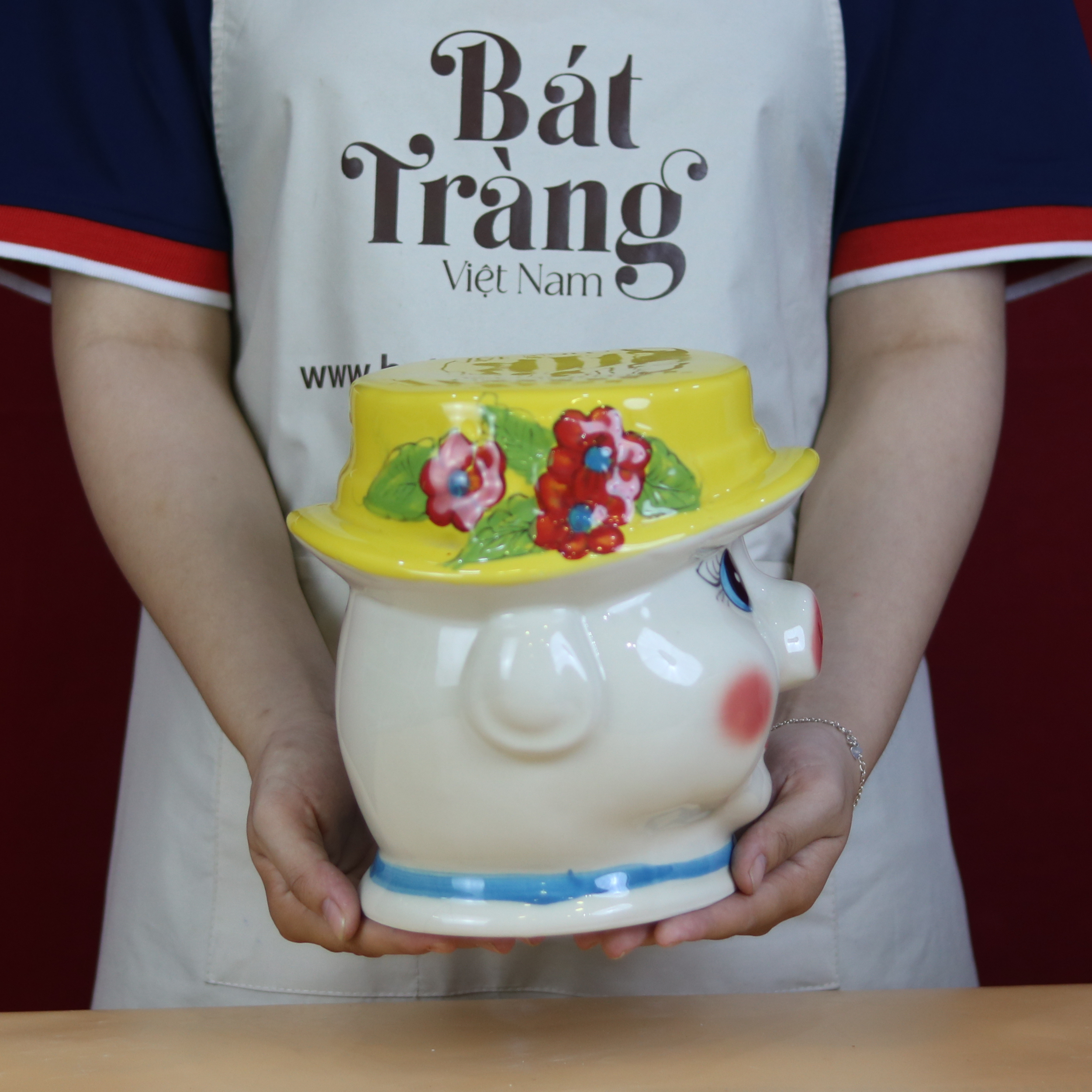 - Vẻ ngoài Hoạt hình: Chú heo được tạo hình như một nhân vật hoạt hình vui nhộn hoặc chú hề thân thiện, với chiếc mũ lưỡi trai màu vàng rực rỡ, điểm xuyết họa tiết hoa lá tinh tế ở cạnh mũ. Đôi má hồng ửng, miệng cười rạng rỡ và đôi mắt xanh biếc lấp lánh mang đến cảm giác vui vẻ, lạc quan mỗi khi nhìn ngắm.