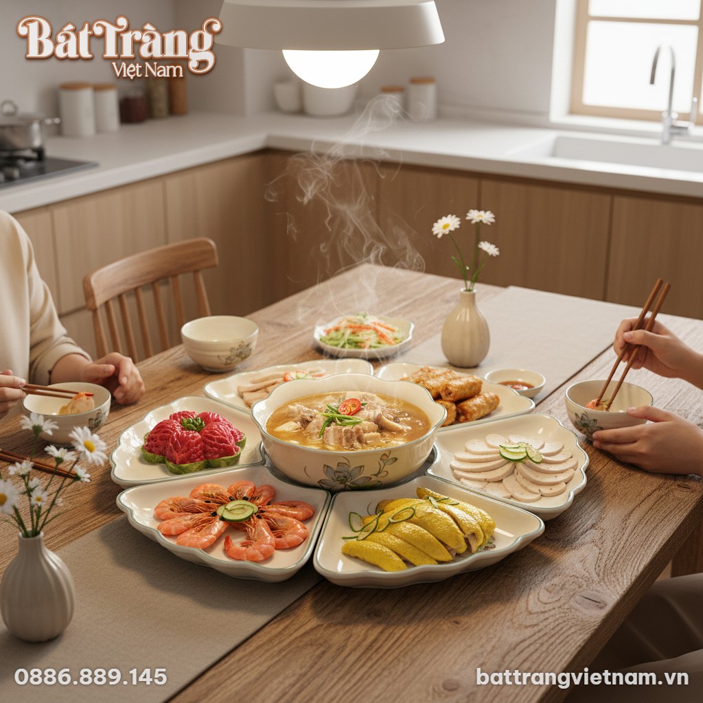 - Đĩa Cánh Hoa Tinh Xảo: Sáu chiếc đĩa nhỏ hình cánh hoa được thiết kế để xếp khít xung quanh tô trung tâm, tạo nên hình ảnh bông hoa sen đang khoe sắc. Mỗi đĩa phục vụ một món ăn riêng biệt, giúp mâm cỗ thêm ngăn nắp và đẹp mắt.
