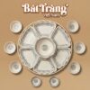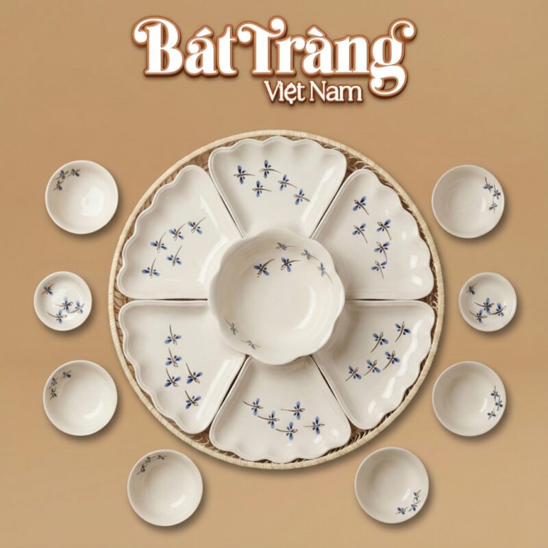 Một điểm cộng không thể bỏ qua là sự hiện diện của chiếc khay mây đan thủ công đi kèm. Khay mây giúp cố định bộ đĩa, tạo sự gọn gàng và dễ dàng di chuyển, đồng thời tăng thêm nét mộc mạc, gần gũi với thiên nhiên, làm nổi bật vẻ đẹp truyền thống của bộ gốm sứ.
