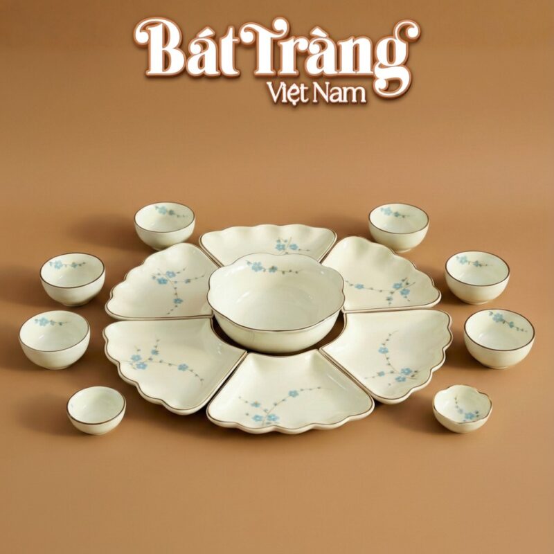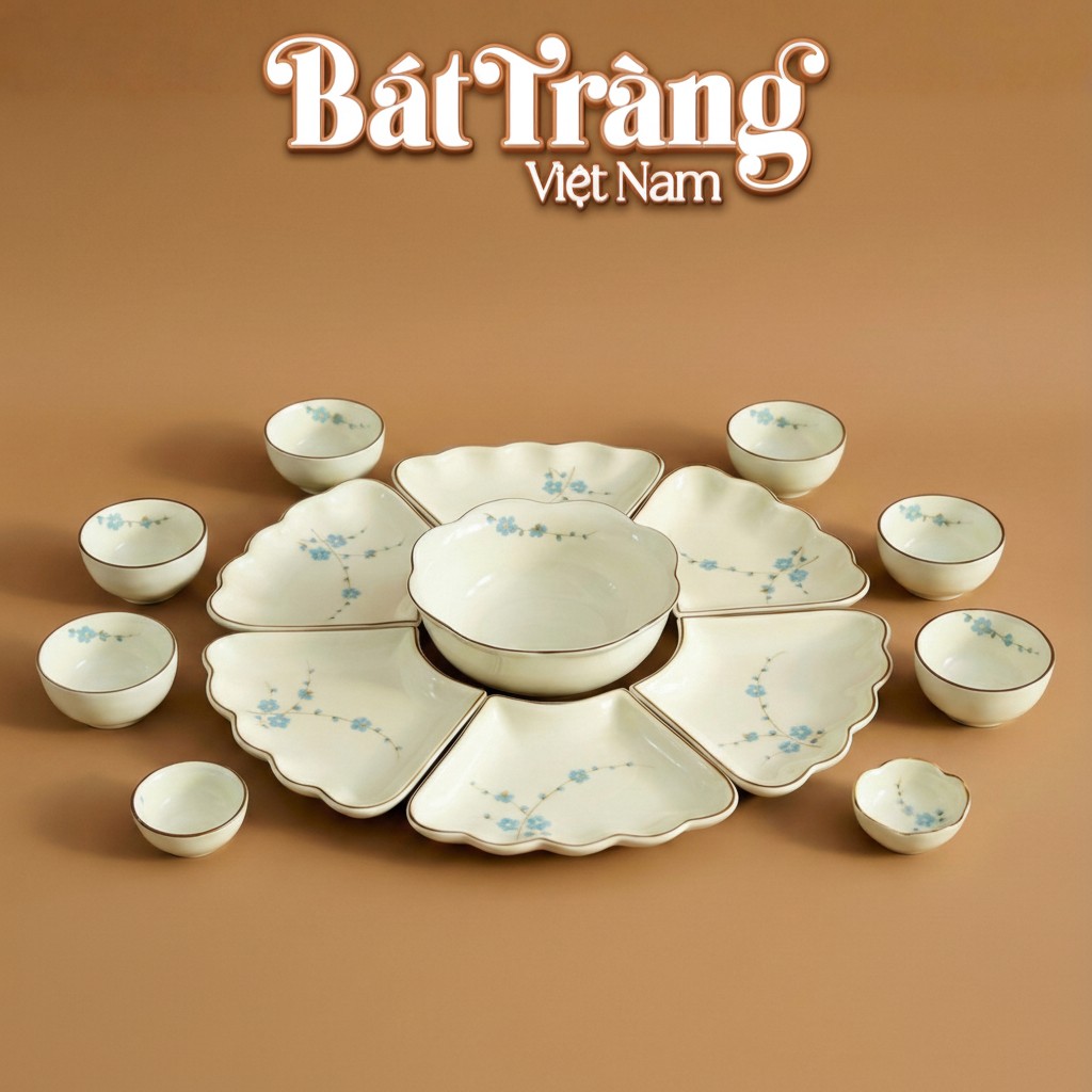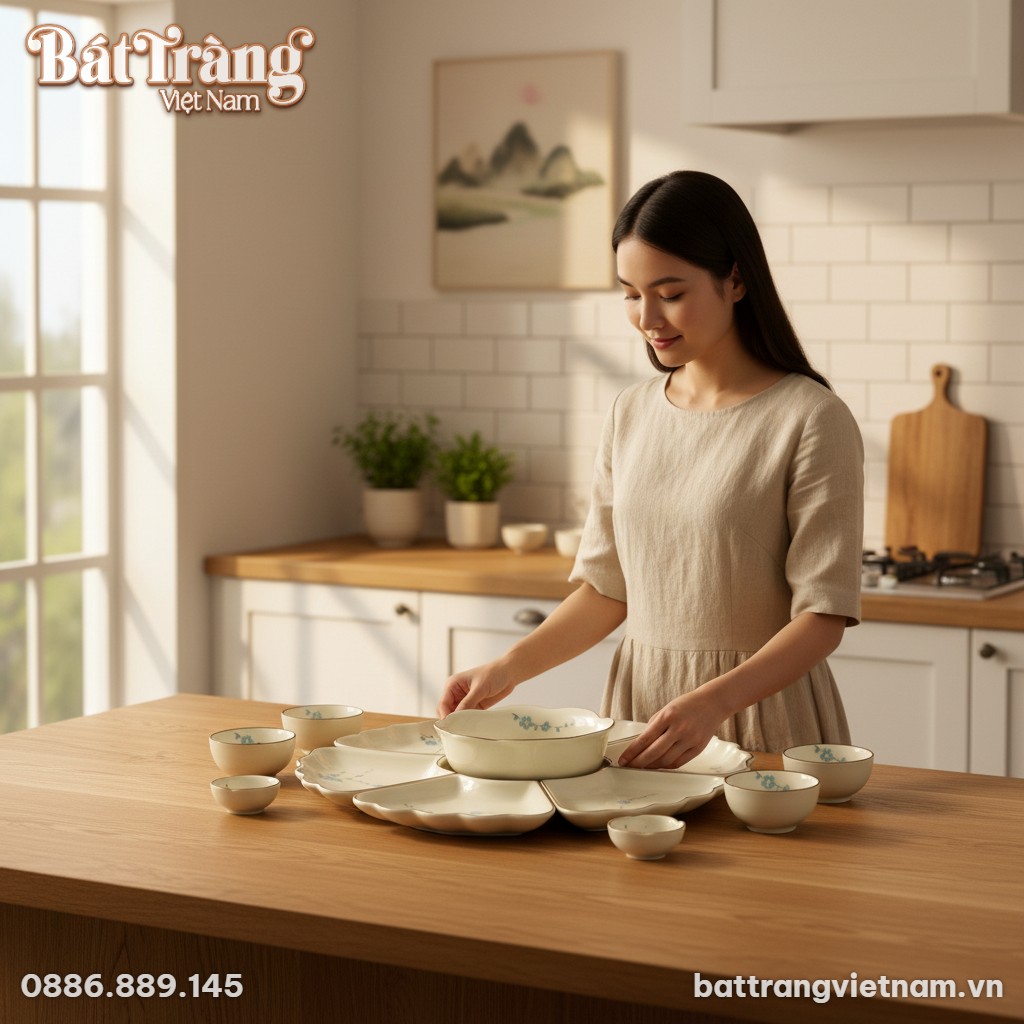 - Cánh hoa: Sáu chiếc đĩa nhỏ hình quạt, với cạnh ngoài lượn sóng mềm mại, được xếp khít khao bao quanh bát tô, tạo thành hình bông hoa đang bung nở. Đây là không gian lý tưởng để bày các món mặn, xào, nộm, giúp phân chia món ăn gọn gàng mà vẫn giữ được vẻ đẹp tổng thể.