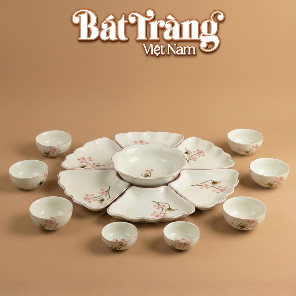 Họa tiết hoa sen hồng được vẽ tay tỉ mỉ là linh hồn của bộ bàn ăn này. Sen hồng, loài hoa quốc hồn quốc túy của Việt Nam, mang vẻ đẹp thuần khiết và tượng trưng cho sự thanh cao, an lành, may mắn. Mỗi nét vẽ trên từng chiếc đĩa, chiếc bát đều thể hiện sự khéo léo và tâm huyết của người nghệ nhân Bát Tràng, đảm bảo họa tiết bền màu theo thời gian và không hề phai nhạt.