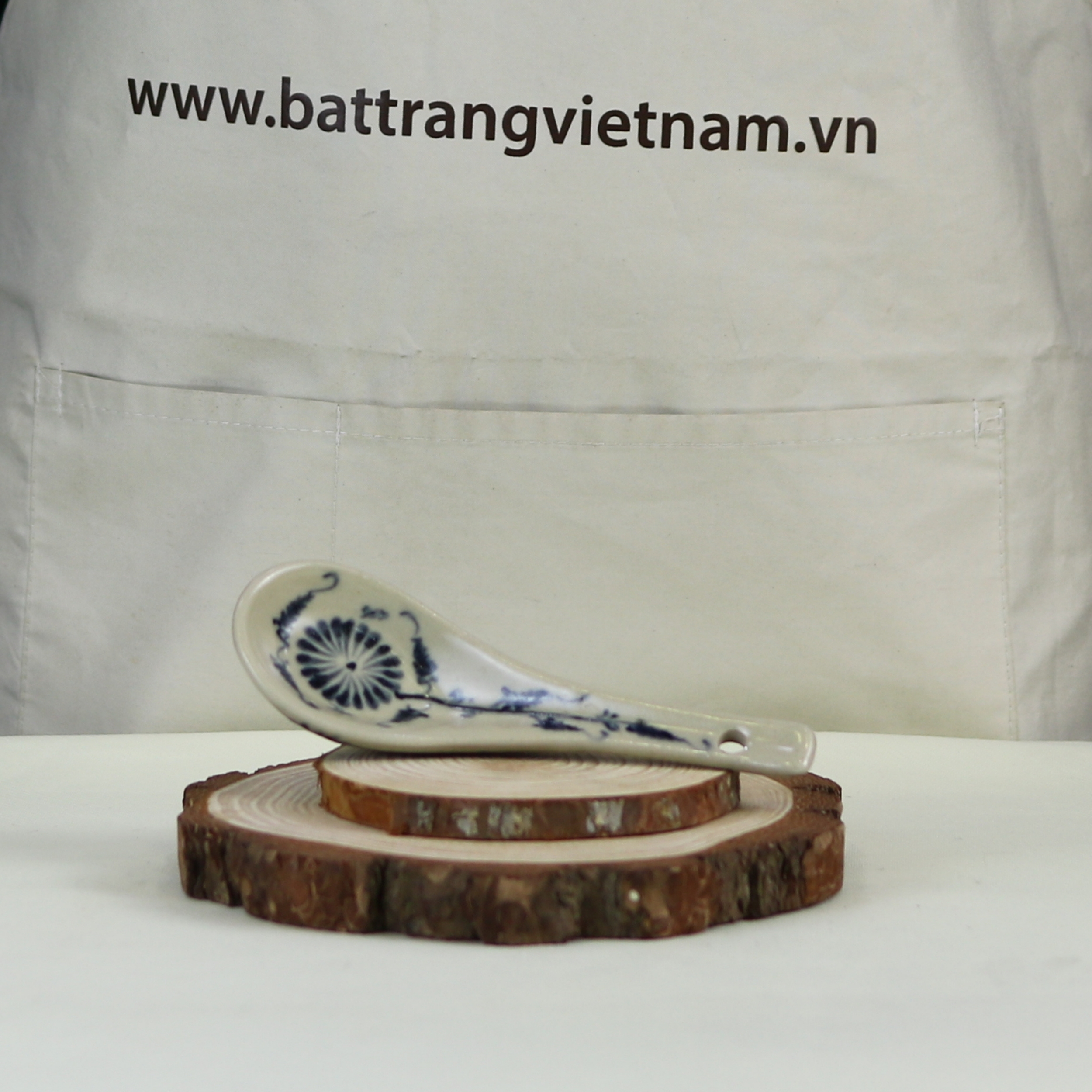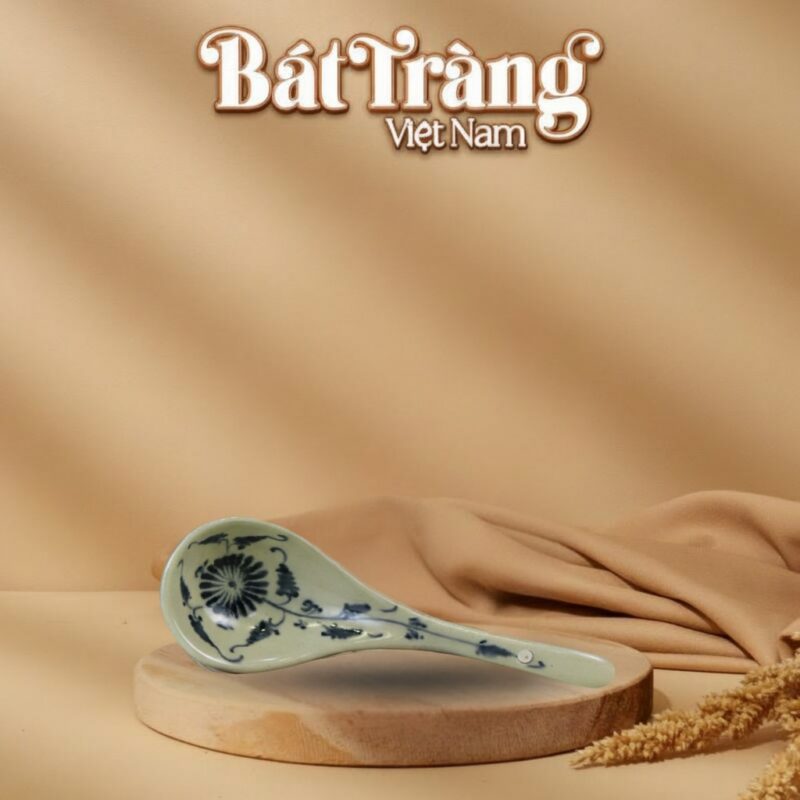 Mỗi chiếc thìa từ Gốm Bát Tràng Việt Nam đều là minh chứng cho tài hoa của người nghệ nhân. Họa tiết hoa cúc/mẫu đơn và lá uốn lượn được vẽ thủ công tỉ mỉ bằng men lam truyền thống trên nền men ngọc xanh nhạt, tạo nên một tác phẩm nghệ thuật sống động và đầy chiều sâu. Sự tinh xảo trong từng đường nét không chỉ tôn vinh vẻ đẹp tự nhiên mà còn mang đến cảm giác bình yên, thư thái trong mỗi bữa ăn.