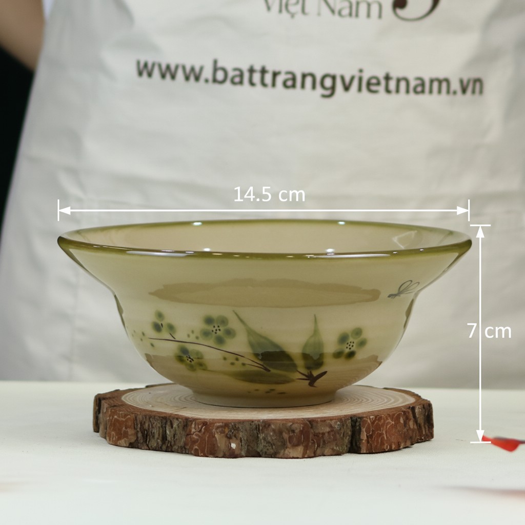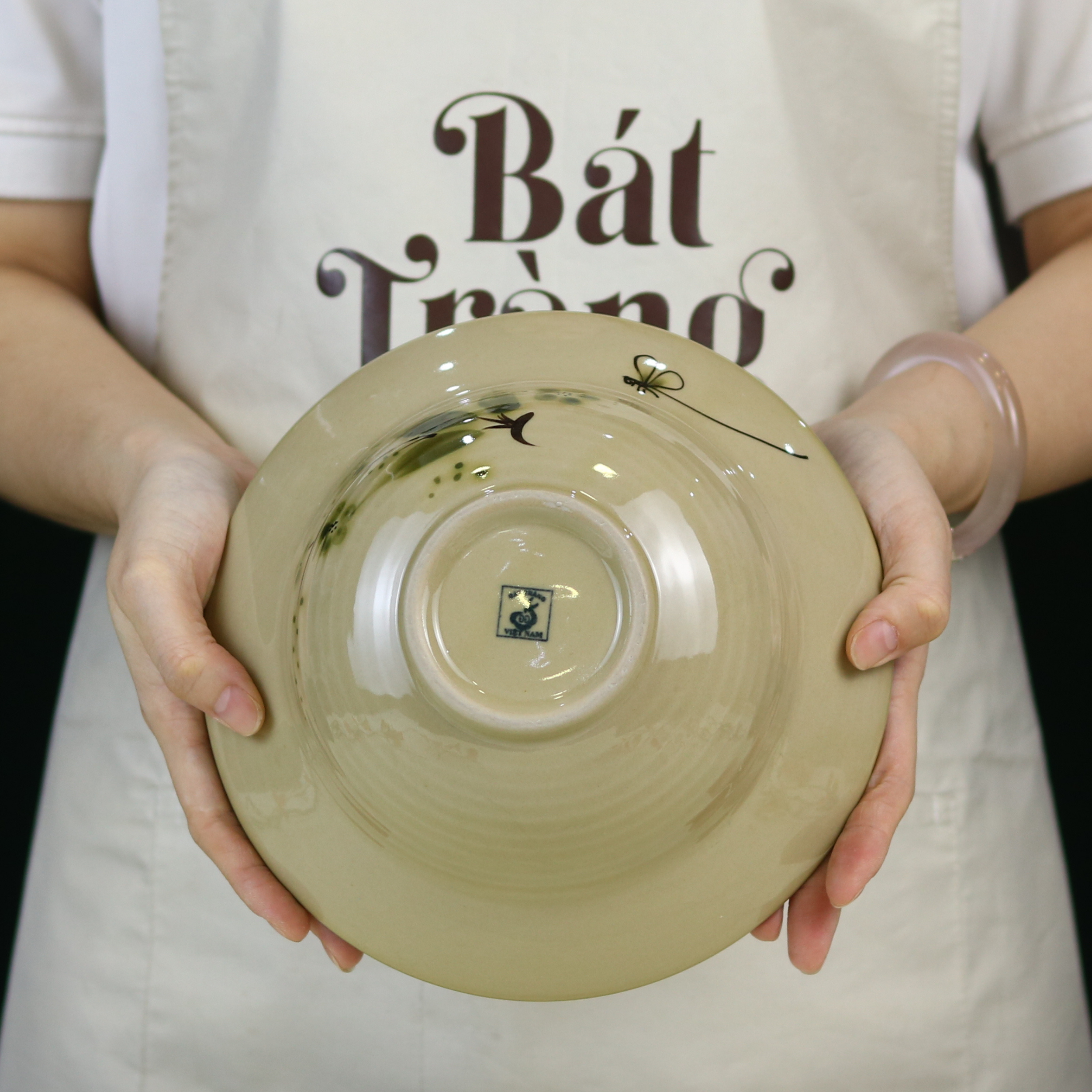 Chiếc tô BT-BD96 được chế tác từ gốm sứ Bát Tràng cao cấp, khoác lên mình lớp men màu kem tự nhiên, ấm áp, tạo cảm giác mộc mạc và thanh lịch. Mỗi chiếc tô đều là kết quả của sự tỉ mỉ, tình yêu nghề của người nghệ nhân Bát Tràng, thể hiện qua từng nét vẽ hoa lá và cánh chuồn chuồn mềm mại, sinh động.