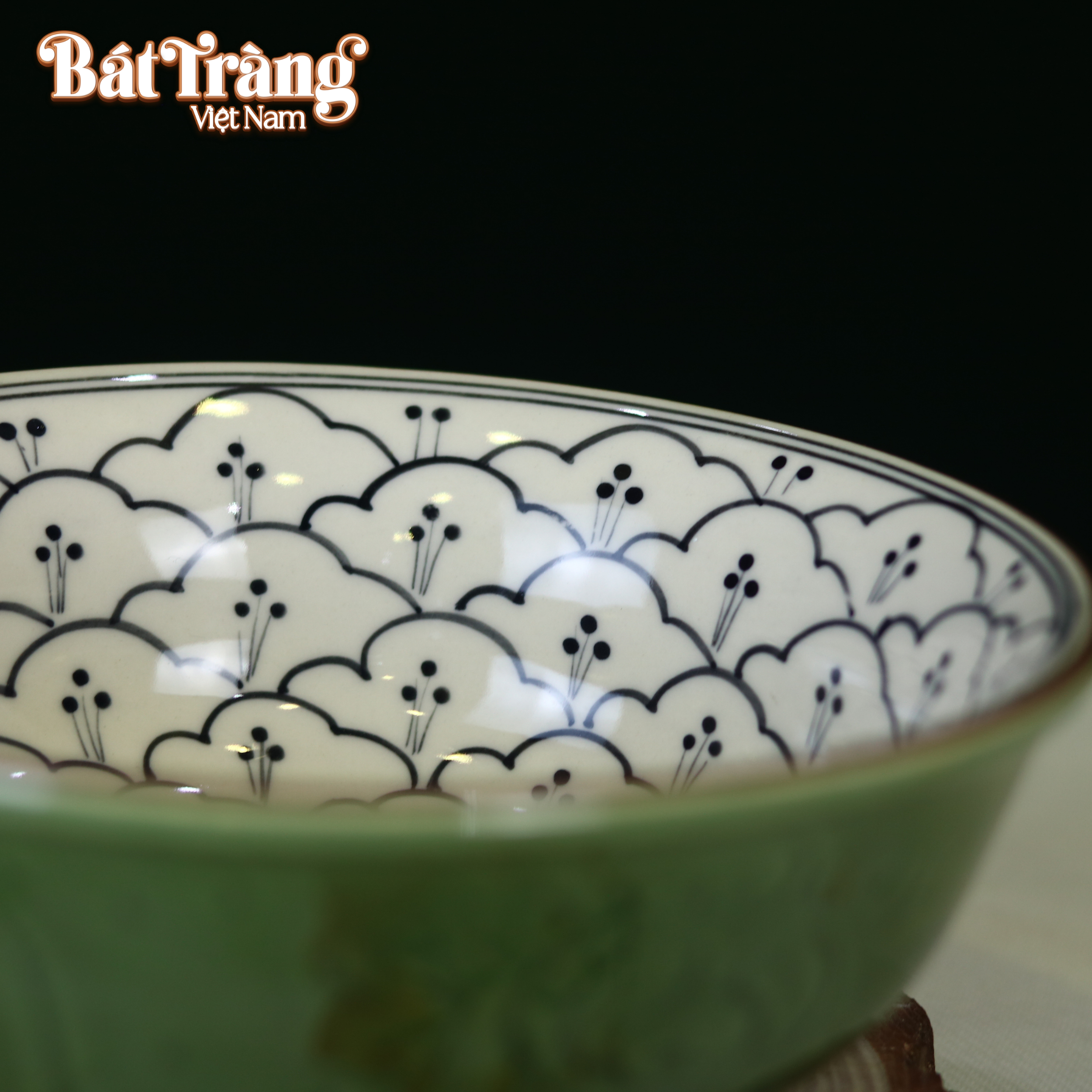 Mỗi chi tiết trên chiếc tô nông này đều được chăm chút tỉ mỉ, thể hiện tài hoa của người nghệ nhân. Bên ngoài, lớp men lục bảo đặc trưng mang đến một sắc xanh trầm ấm, sang trọng, được điểm xuyết bằng những họa tiết vân mây hoặc dây leo chạm nổi tinh xảo.