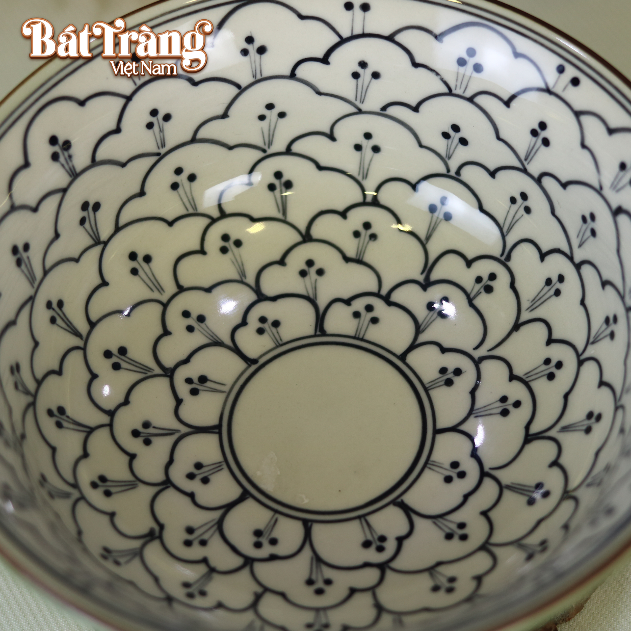 Ngược lại, lòng tô được phủ men trắng ngà, làm nổi bật họa tiết sóng nước hoặc vảy rồng được vẽ tay một cách công phu bằng màu xanh cobalt. Đây là minh chứng rõ nét cho kỹ thuật vẽ tay điêu luyện của nghệ nhân Bát Tràng, mang đến sự uyển chuyển và độc đáo cho từng sản phẩm. Sự tương phản giữa nét mộc mạc bên ngoài và sự tinh xảo bên trong tạo nên một tổng thể hài hòa, thu hút ánh nhìn.