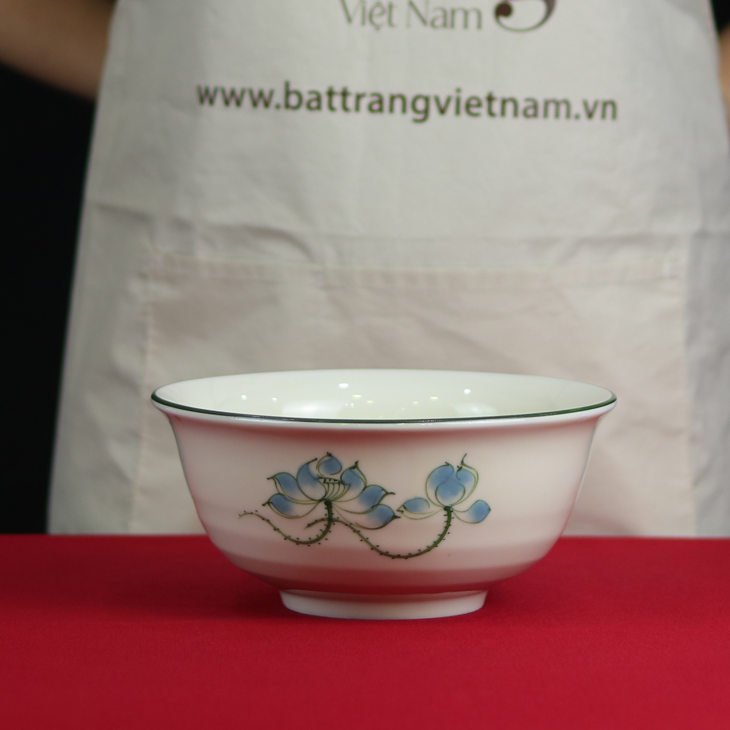 Nước men trắng bóng, mịn màng là nền hoàn hảo để những bông sen xanh tươi tắn nổi bật. Đường viền xanh thanh thoát chạy quanh miệng tô không chỉ tạo điểm nhấn mà còn khéo léo định hình sự cân đối cho tổng thể sản phẩm, phản ánh sự tinh tế trong từng chi tiết của gốm sứ Bát Tràng.