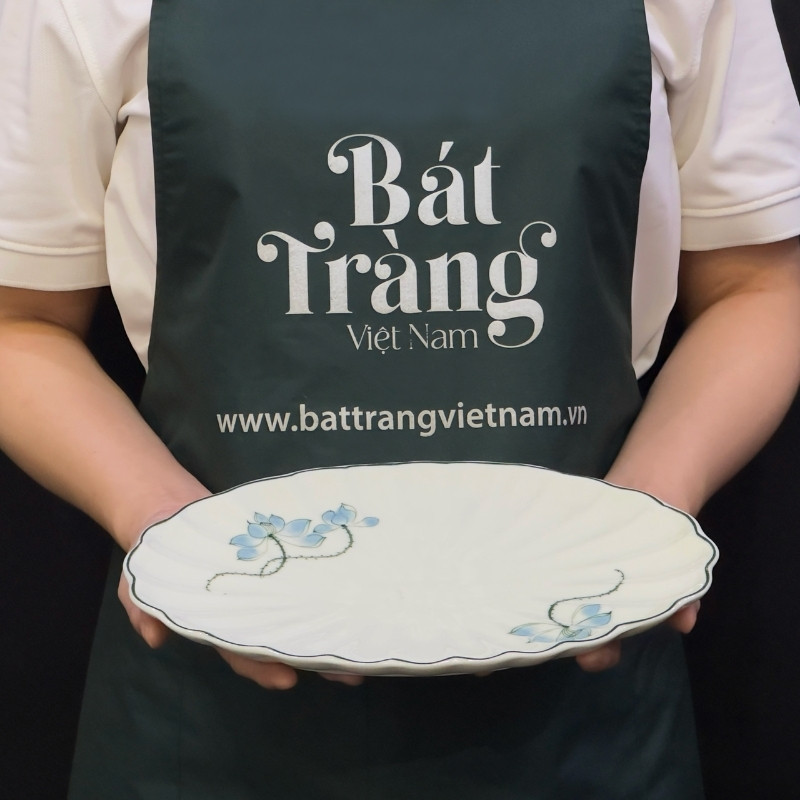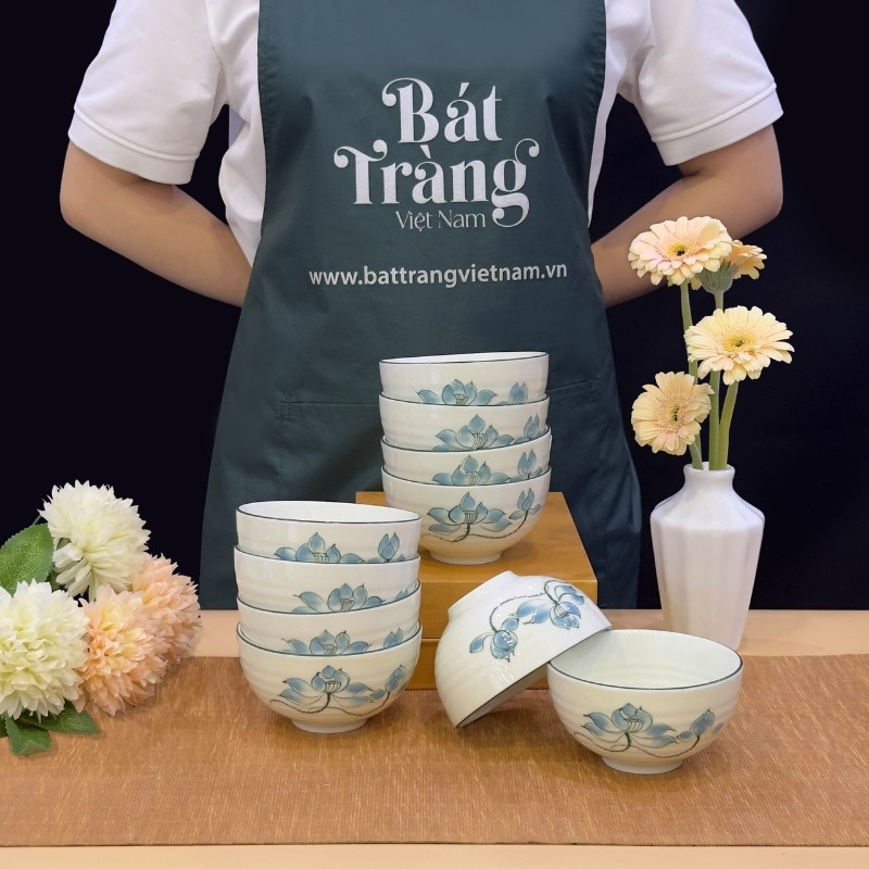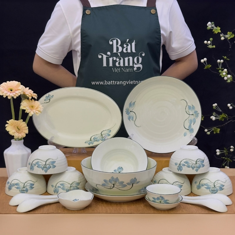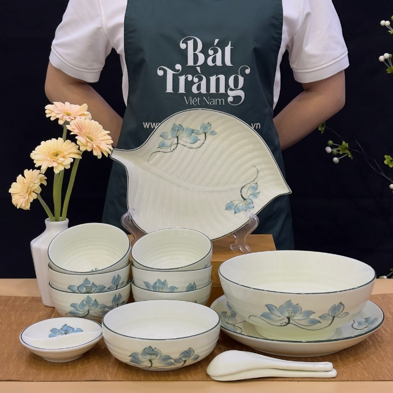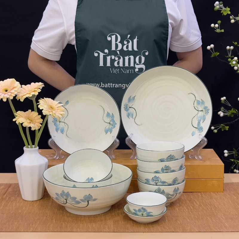 Bộ bát đĩa sứ trắng họa tiết hoa sen xanh Bát Tràng là dòng sản phẩm đang được nhiều chị em phụ nữ quan tâm dạo gần đây.