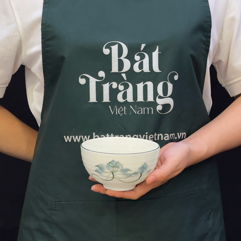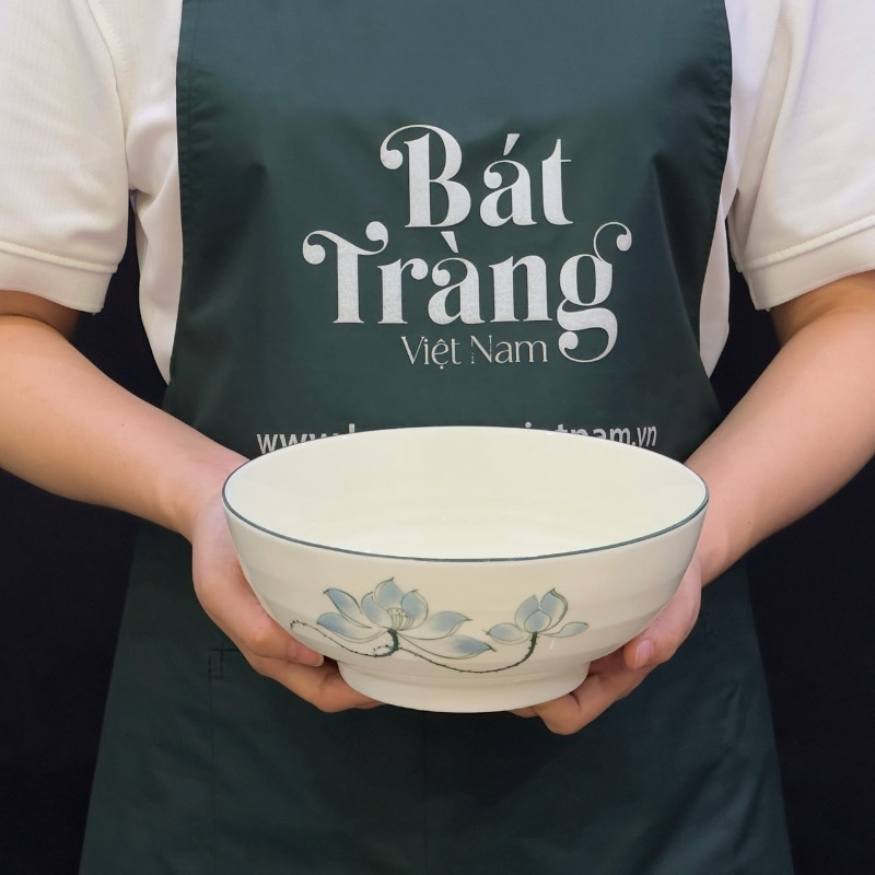 Bộ bát đĩa sứ trắng với tông màu men sứ trắng được tô điểm bởi những bông hoa sen xanh ngắt kết hợp với đường viền đen xung quanh sản phẩm. Có thể thấy, người thợ đã rất tâm đắc khi tạo ra sản phẩm này.