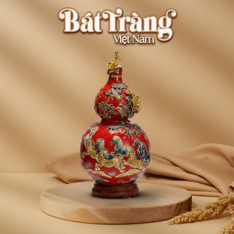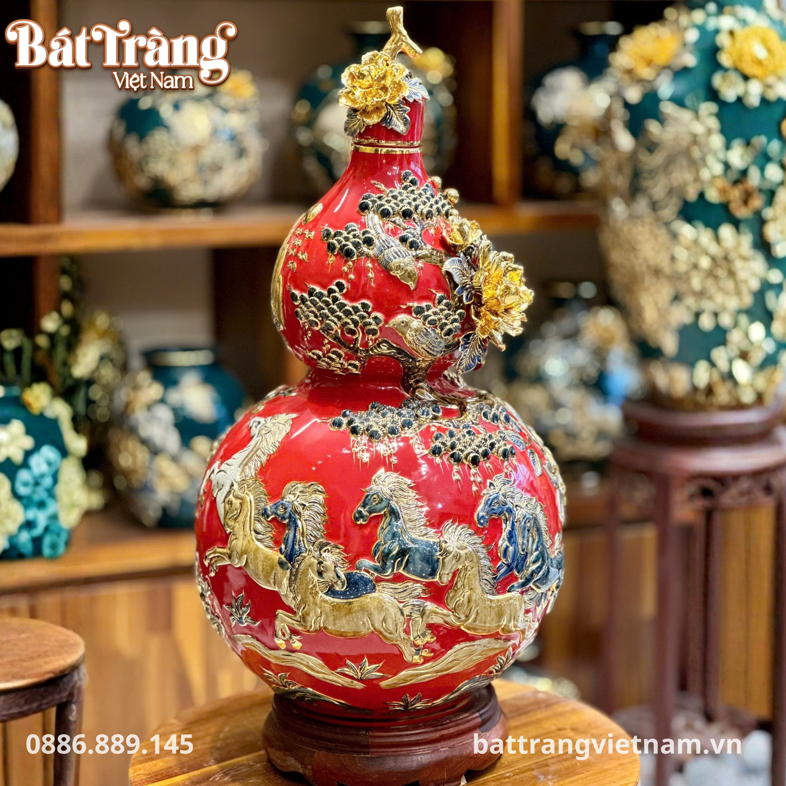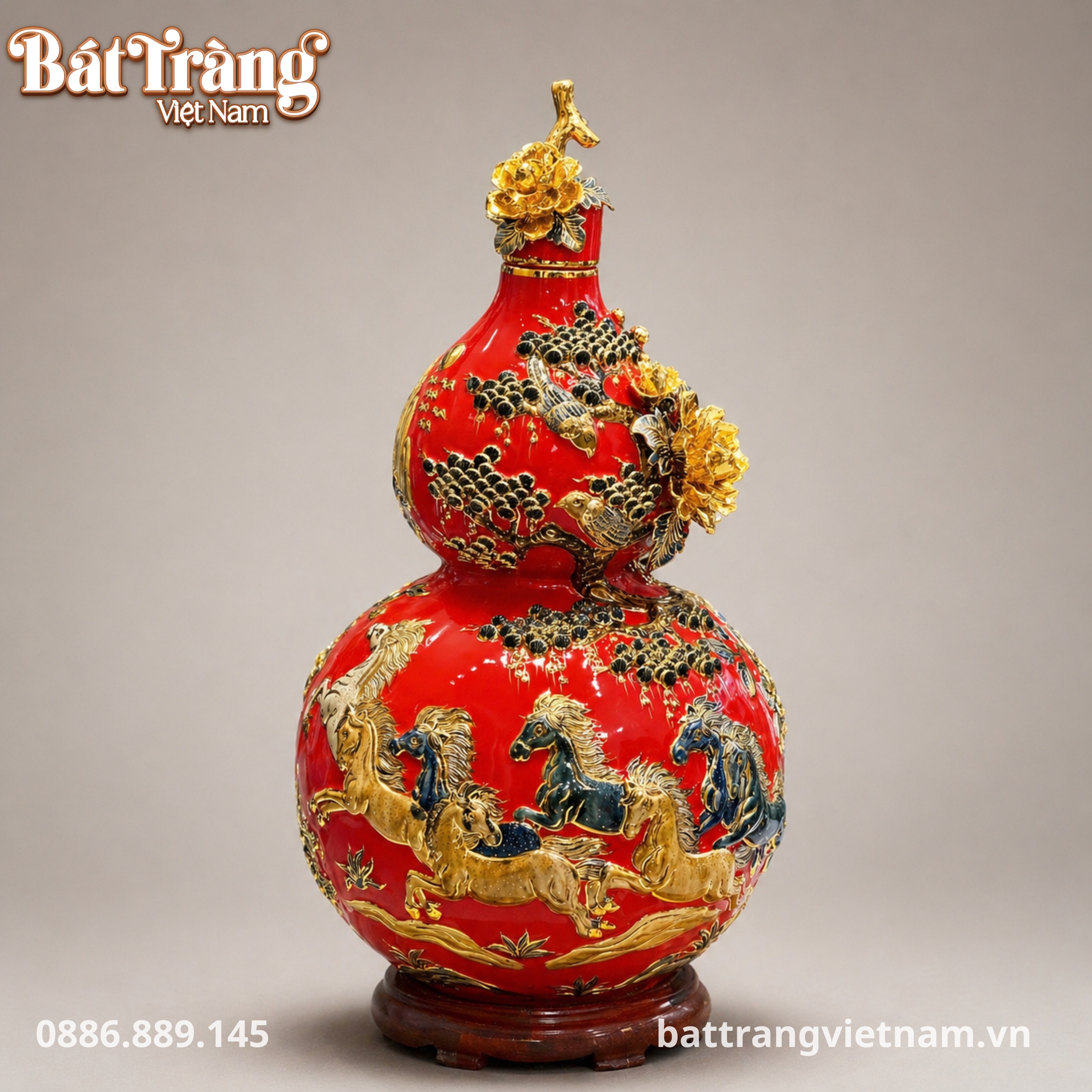 Bình hồ lô “Mã đáo thành công” màu đỏ vẽ vàng 24k BT-HL23 là một tuyệt tác đỉnh cao của nghệ thuật gốm sứ phong thủy, được chế tác tinh xảo từ làng nghề truyền thống Bát Tràng. Sản phẩm này không chỉ đơn thuần là một vật phẩm trang trí, mà còn là biểu tượng mạnh mẽ của sự may mắn, tài lộc và thăng tiến, mang đến nguồn năng lượng tích cực cho không gian sống và làm việc.