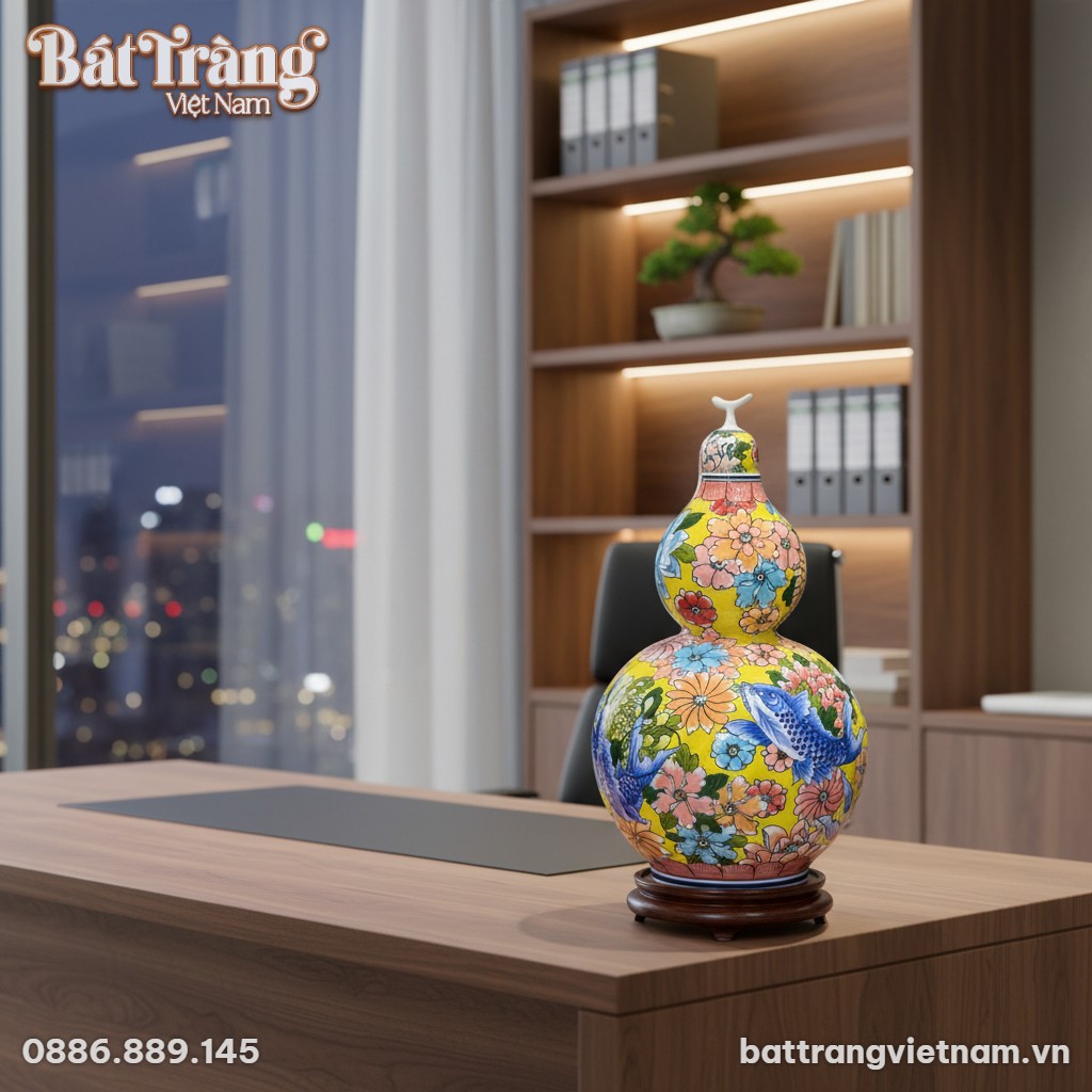Bình Hồ Lô Phú Quý Song Ngư Cát Tường Men Vàng Bát Tràng BT-HL17 là một tuyệt tác gốm sứ, mang đậm giá trị phong thủy và vẻ đẹp nghệ thuật truyền thống của làng nghề Bát Tràng. Với sắc men vàng rực rỡ cùng họa tiết “Song Ngư Hý Thủy” sống động, tác phẩm này thắp sáng không gian sống, đồng thời lan tỏa vượng khí tài lộc, may mắn và bình an.