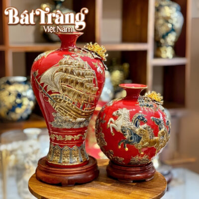 Các họa tiết trên thân bình được thực hiện hoàn toàn thủ công với kỹ thuật đắp nổi và vẽ vàng cực kỳ tinh xảo.