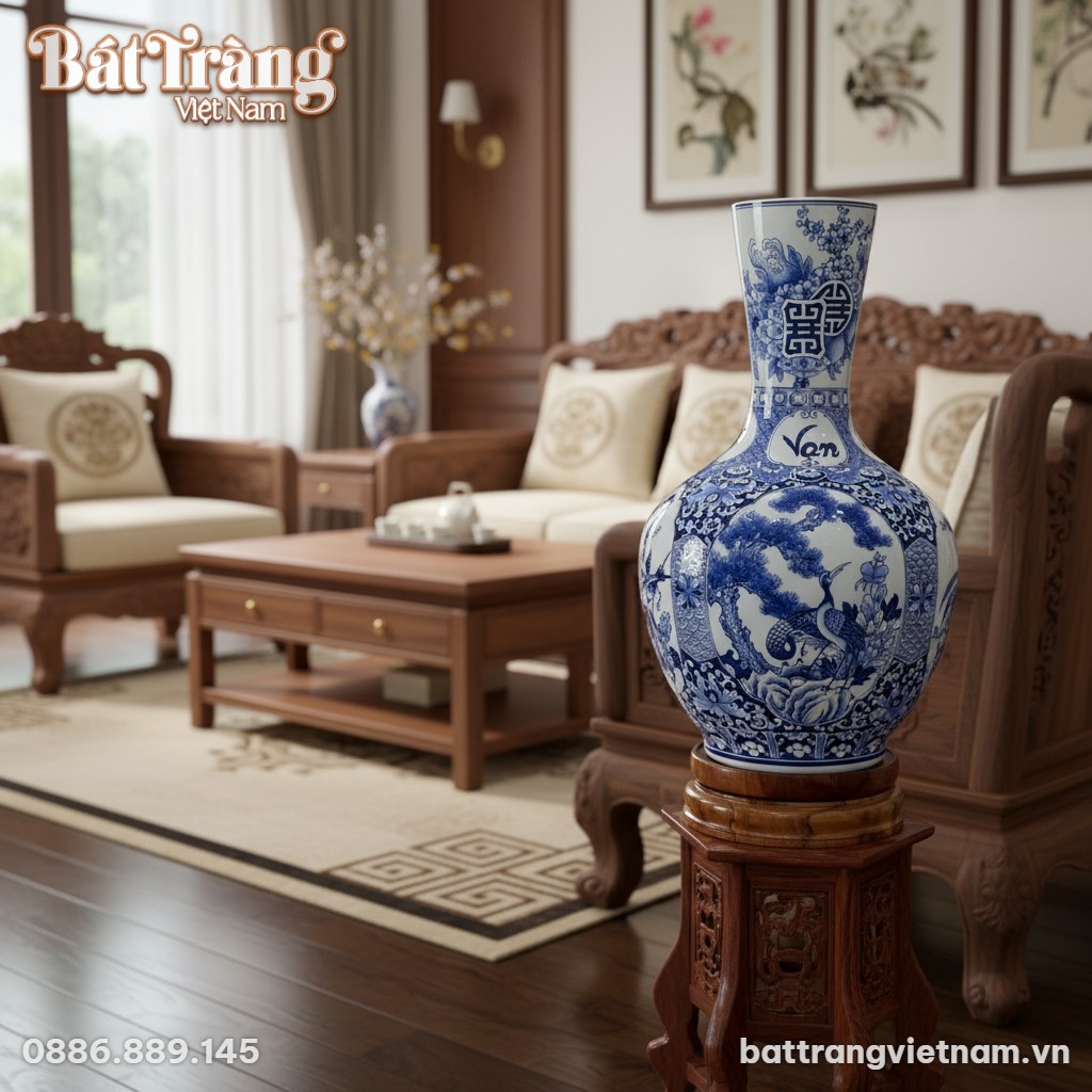 Đặc biệt, bốn chữ thư pháp “Vạn”, “Sự”, “Như”, “Ý” được khéo léo lồng ghép trên thân bình, tạo thành thông điệp “Vạn Sự Như Ý” – lời chúc tốt đẹp nhất cho mọi công việc hanh thông, mọi ước nguyện thành hiện thực. Sự kết hợp này nâng tầm giá trị thẩm mỹ và đồng thời làm sâu sắc thêm ý nghĩa phong thủy, biến chiếc bình thành một vật phẩm mang năng lượng tích cực mạnh mẽ.