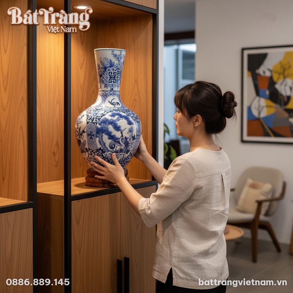 Lưu ý tránh đặt bình đối diện trực tiếp cửa chính để tránh thất thoát tài lộc. Kết hợp bình với chân đế gỗ đi kèm sẽ tăng thêm sự trang trọng và vững chãi.