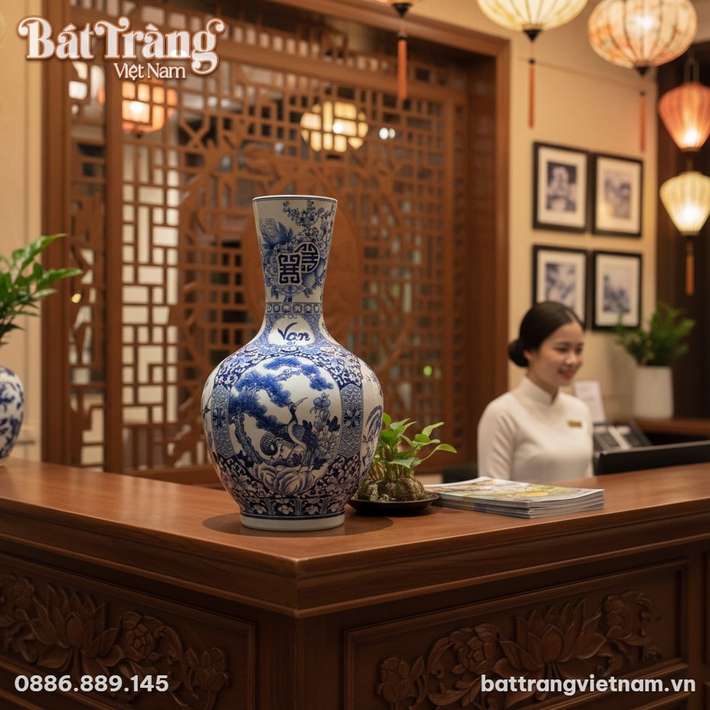 Sản phẩm được chế tác từ chất liệu gốm sứ Bát Tràng cao cấp, trải qua quy trình nung ở nhiệt độ rất cao, lên đến 1200-1300°C. Chính nhiệt độ nung lý tưởng này đã thanh lọc hoàn toàn tạp chất, đảm bảo an toàn tuyệt đối cho sức khỏe, đồng thời kiến tạo nên độ bền vượt trội, khả năng chống chịu va đập mạnh mẽ và giữ cho sắc men bền vững vĩnh cửu theo thời gian. Bề mặt bình được phủ lớp men lam truyền thống, với sắc xanh coban rõ nét trên nền sứ trắng ngà đặc trưng, tạo nên vẻ đẹp sang trọng, cổ kính và dễ dàng vệ sinh.