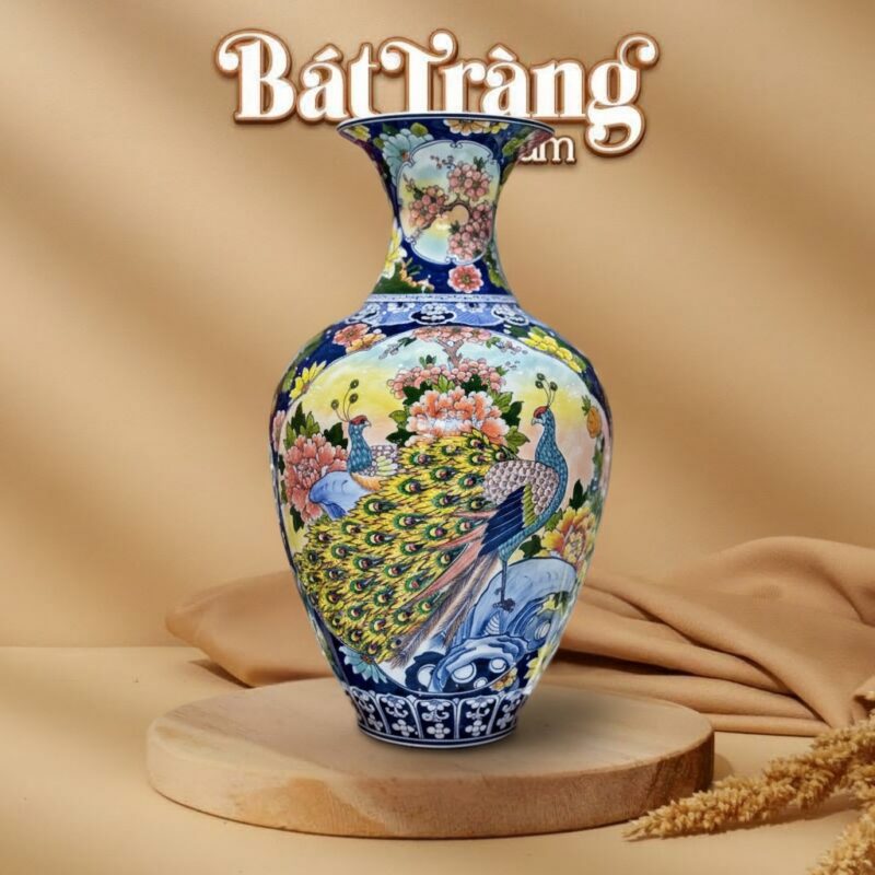 - Cảnh 1: Công Đào Phú Quý – Một mặt bình được điểm xuyết bởi hình ảnh đôi chim công duyên dáng bên cành hoa đào rực rỡ và những đóa mẫu đơn khoe sắc. Hình ảnh chim công biểu trưng cho sự vương giả, uy quyền và vẻ đẹp hoàn mỹ, kết hợp với hoa đào và mẫu đơn mang ý nghĩa của sự trường thọ, phú quý và tình duyên viên mãn. Toàn bộ cảnh sắc được thể hiện bằng men màu đa sắc sống động trên nền men trắng bóng, tạo nên một bức tranh tràn đầy sinh khí và may mắn.