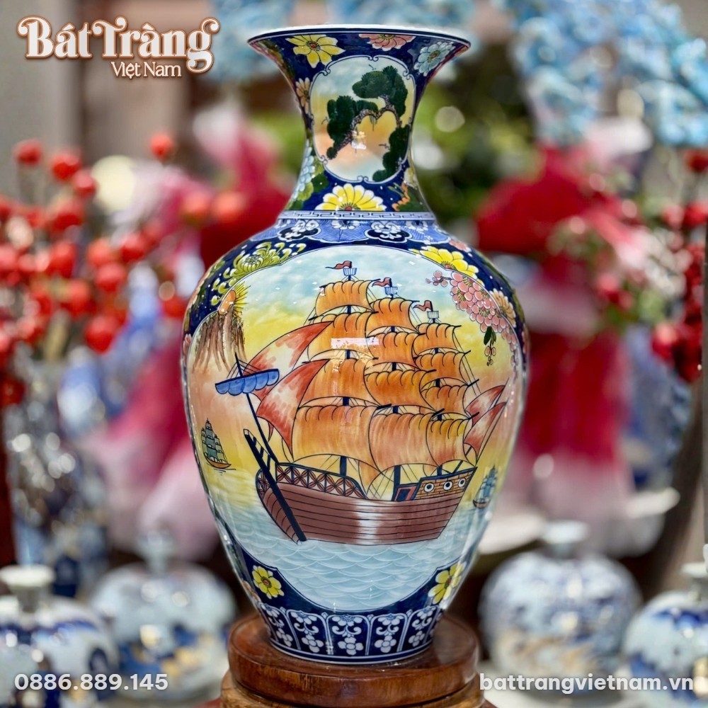 - Cảnh 2: Thuận Buồm Xuôi Gió – Mặt còn lại của bình là bức tranh “Thuận Buồm Xuôi Gió” đầy ý nghĩa, với hình ảnh con thuyền buồm no gió lướt trên sóng nước, hướng về phía chân trời. Đây là lời chúc tụng cho mọi công việc hanh thông, xuôi chèo mát mái, đặc biệt ý nghĩa với những doanh nhân, người làm ăn kinh doanh, mong cầu sự nghiệp phát triển bền vững. Từng chi tiết của cánh buồm, con sóng được vẽ tay tỉ mỉ, toát lên sự mạnh mẽ và kiên định.