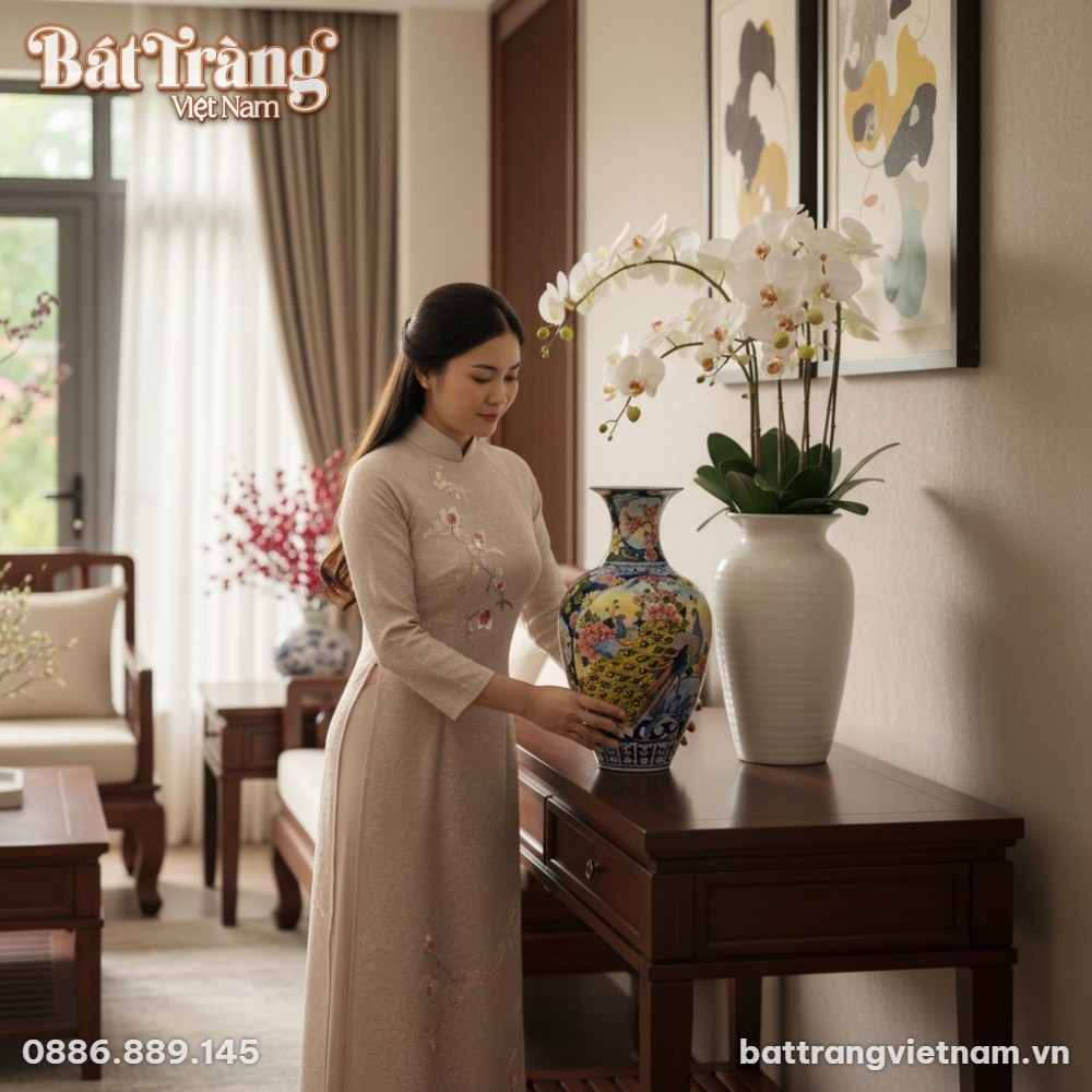 - Phòng Khách hoặc Sảnh Lớn: Đặt bình trên đôn kệ, trong tủ kính ở những nơi trang trọng, kín đáo để tụ tài lộc, thu hút vượng khí cho toàn bộ không gian.