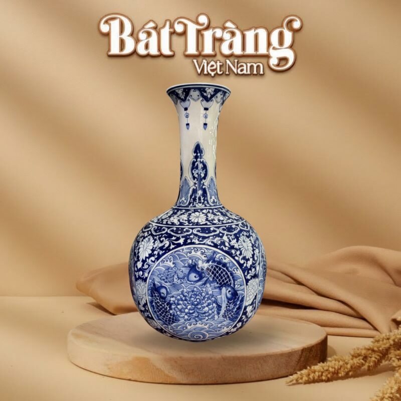 Chiếc lọ tỏi hút lộc này được thổi hồn bởi những nghệ nhân tài hoa của Gốm Bát Tràng Việt Nam, nơi lưu giữ bí quyết chế tác hàng trăm năm. Họa tiết trên thân bình là bức tranh sinh động của cá chép bơi giữa hoa sen và sóng nước, một biểu tượng kinh điển trong văn hóa Á Đông.