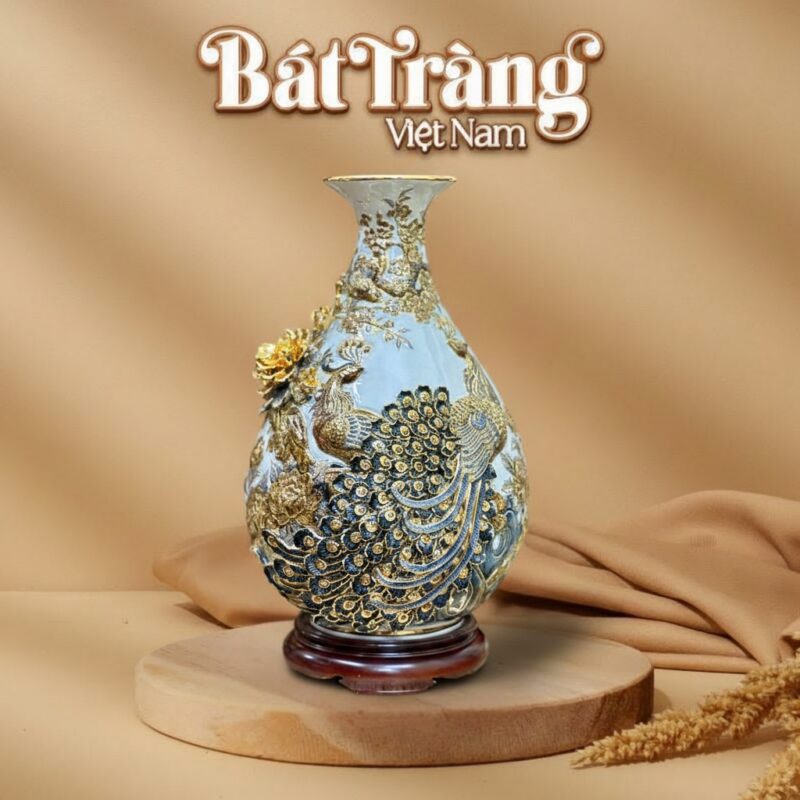 - Khổng Tước (Công): Họa tiết Khổng Tước được đắp nổi công phu ở mặt trước, với bộ lông vũ lộng lẫy được vẽ vàng 24k tỉ mỉ. Khổng Tước là biểu tượng của sự quyền quý, vẻ đẹp vương giả, mang lại may mắn và thu hút tài lộc, thịnh vượng cho gia chủ.