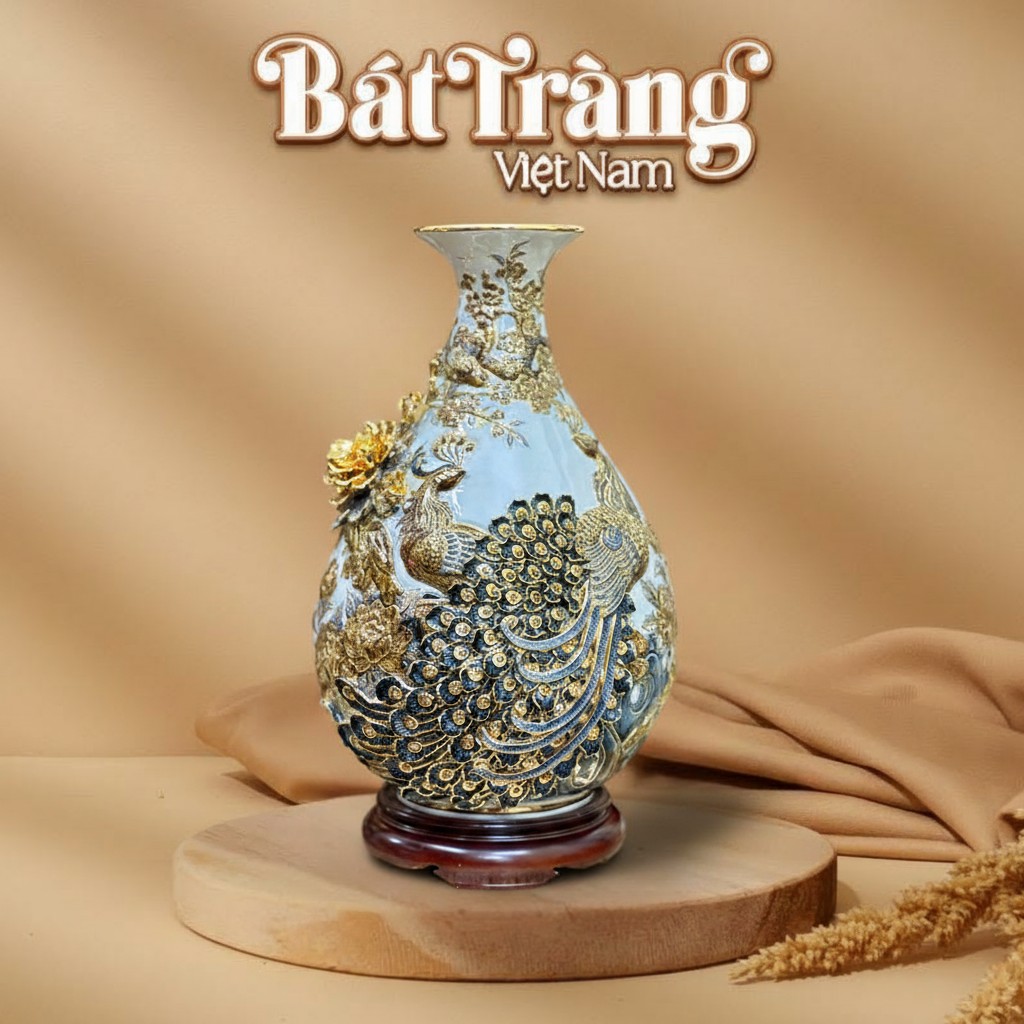 Chiếc bình tỳ bà BT-LTB04 được tạo tác bởi những nghệ nhân tài hoa của Bát Tràng, nơi giữ gìn và phát huy những kỹ thuật làm gốm truyền thống kết hợp nét hiện đại. Từng đường nét, họa tiết đều được thực hiện thủ công, từ khâu tạo hình đến đắp nổi và vẽ vàng kim, tạo nên một tác phẩm nghệ thuật có một không hai.