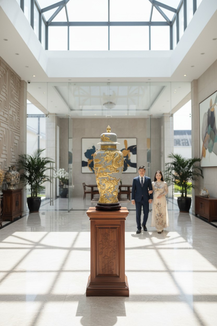 Chiếc chóe cao 80cm này không chỉ đáp ứng những yêu cầu khắt khe về thẩm mỹ mà còn mang trong mình những câu chuyện ý nghĩa sâu sắc, biến không gian sống hoặc làm việc của gia chủ trở nên uy nghi và đẳng cấp hơn.