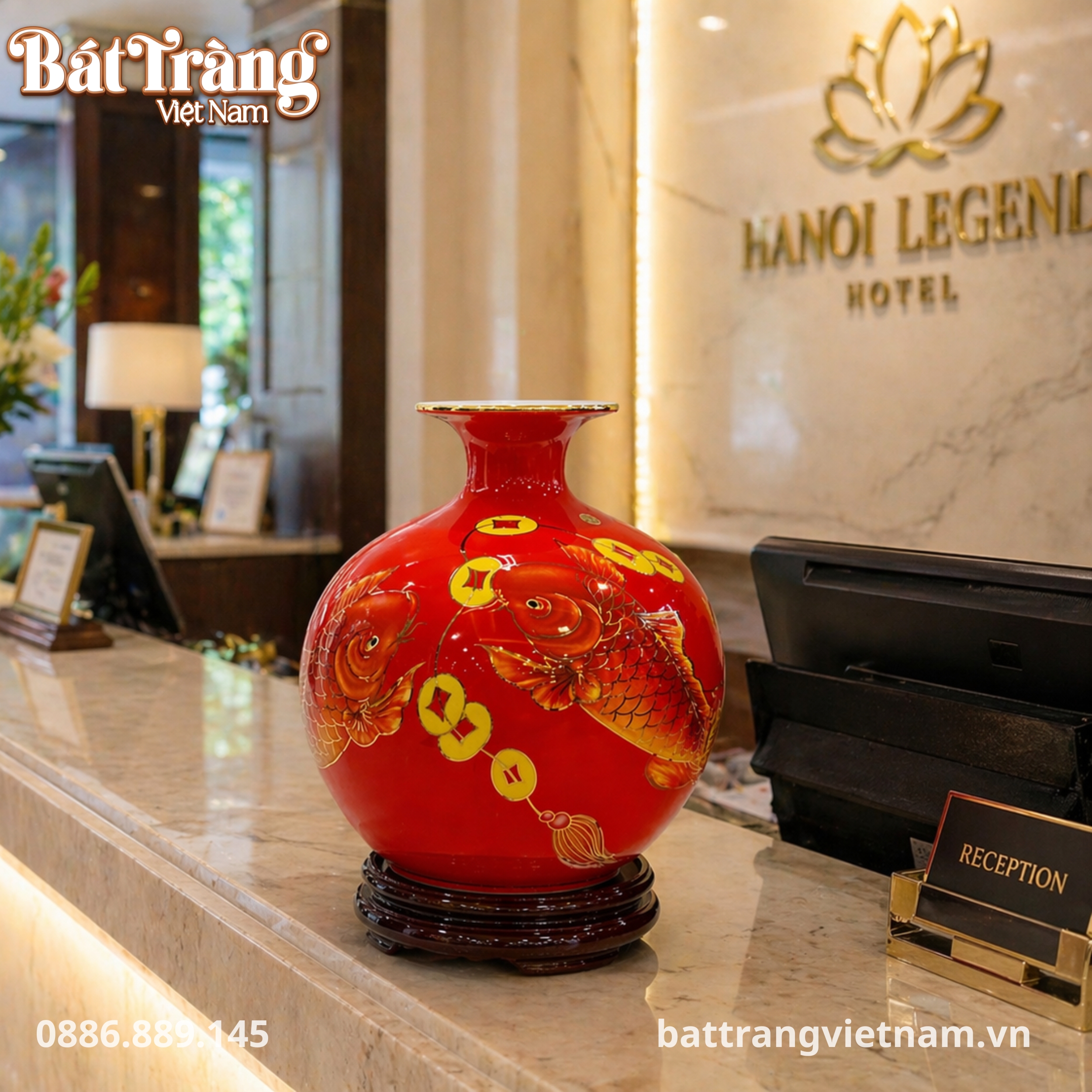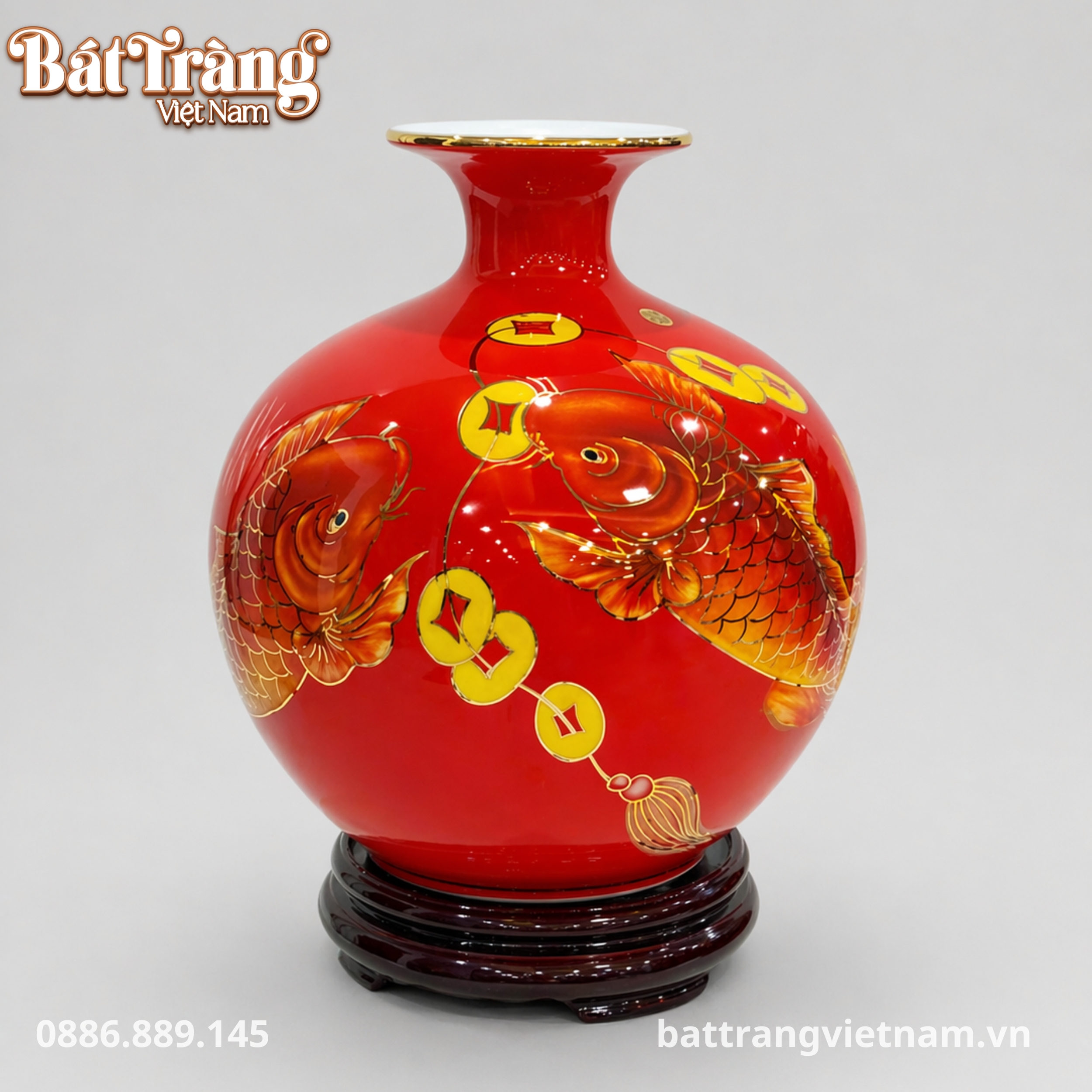 - Vẽ vàng 24k tinh xảo: Họa tiết hoa mẫu đơn và cá chép vàng kim được vẽ tay thủ công với vàng 24k nguyên chất, mang lại vẻ lấp lánh, quyền quý và giá trị trường tồn.