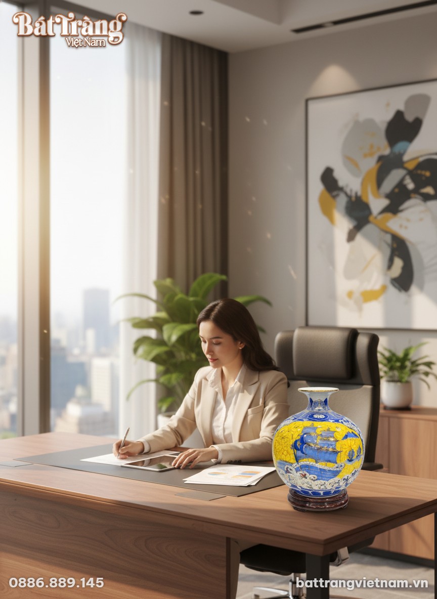 Chiếc bình hút lộc này được chế tác từ chất liệu gốm sứ Bát Tràng cao cấp, trải qua quy trình nung luyện khắt khe ở nhiệt độ cao, đảm bảo độ bền vượt thời gian và khả năng chống chịu va đập tốt. Lớp men bóng mịn, với sự kết hợp hài hòa giữa màu xanh coban trầm lắng, vàng rực rỡ và trắng ngà, không chỉ tạo nên vẻ ngoài tươi sáng mà còn giúp bảo vệ họa tiết, duy trì vẻ đẹp nguyên bản theo năm tháng. Sản phẩm đi kèm kệ gỗ chắc chắn, tôn thêm vẻ trang trọng khi trưng bày.
