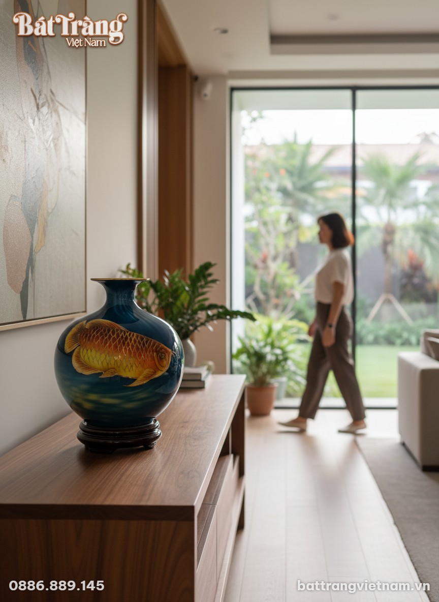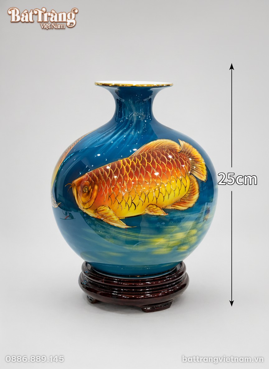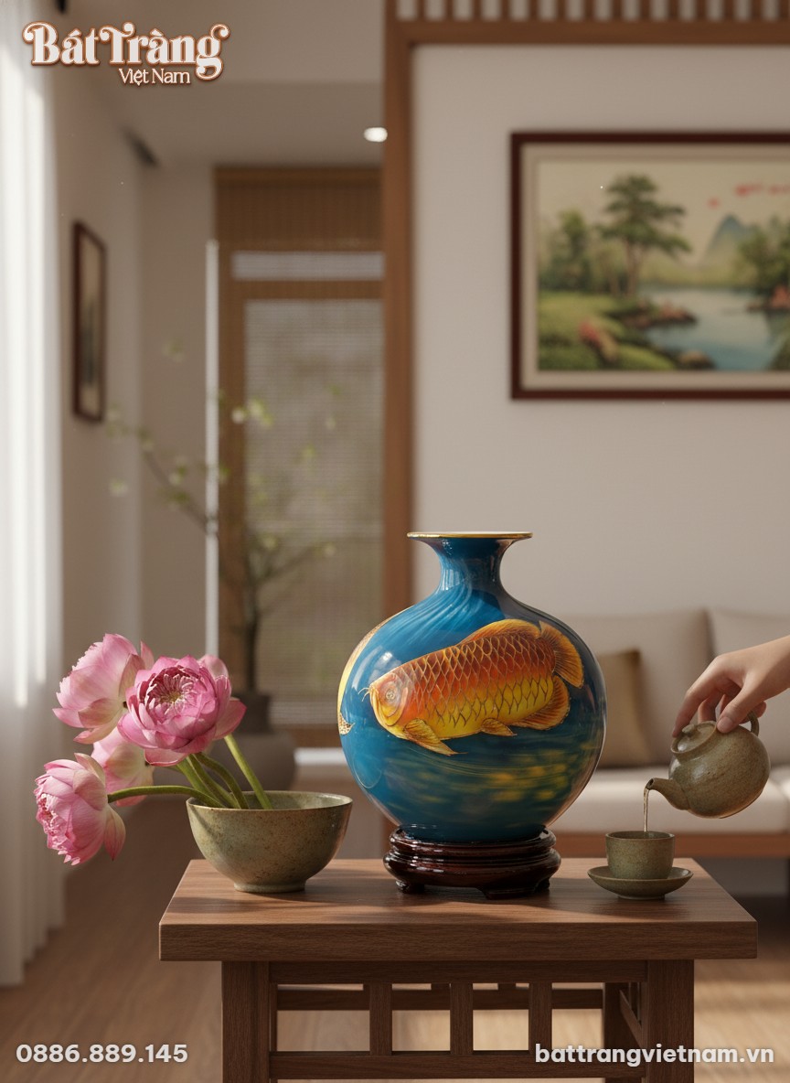Cá rồng, hay còn gọi là Arowana, từ lâu đã được xem là “Vua của các loài cá cảnh” và là biểu tượng mạnh mẽ trong phong thủy, tượng trưng cho sự giàu sang, quyền quý, may mắn và ý chí kiên cường vươn lên mọi khó khăn để đạt được thành công. Họa tiết cá rồng vàng trên nền men xanh thẳm của bình không chỉ là sự kết hợp màu sắc hài hòa mà còn là lời chúc phúc cho gia chủ về một cuộc sống sung túc, thịnh vượng.