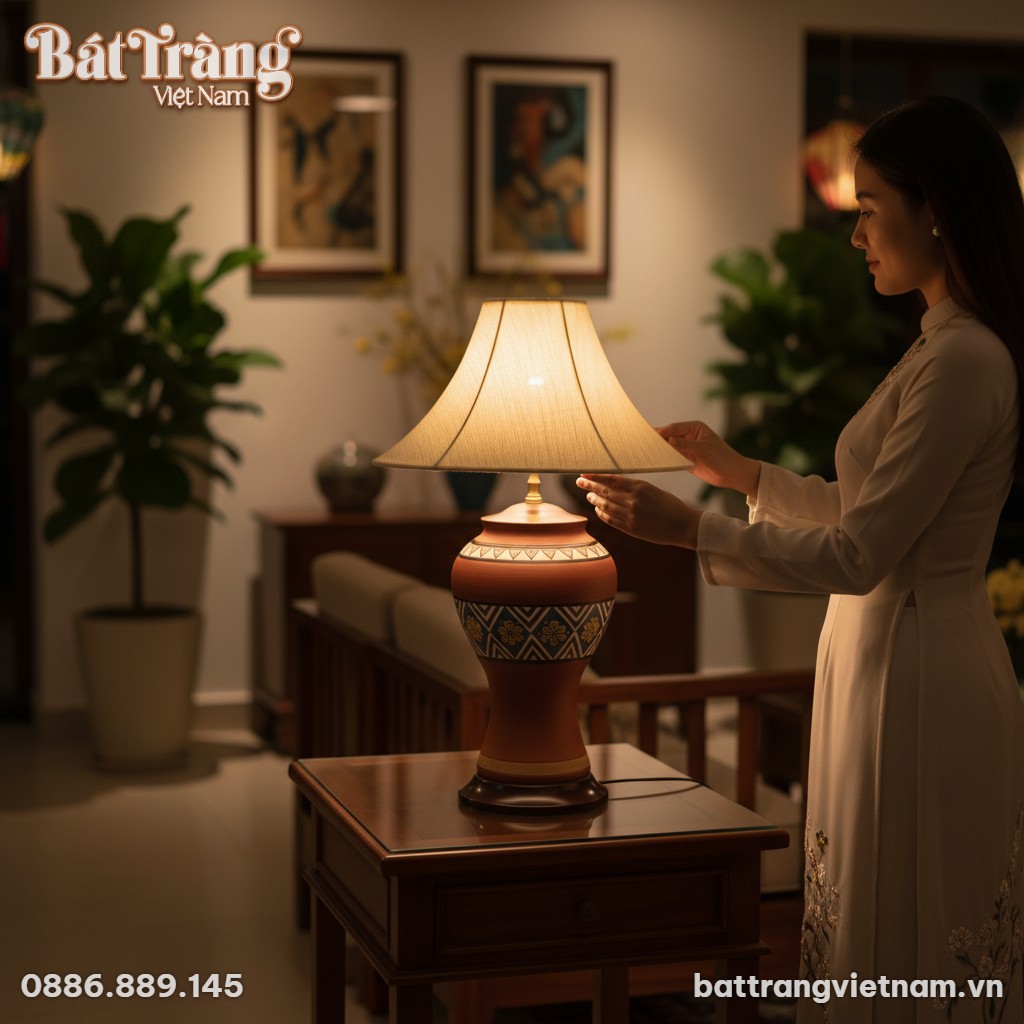 Điều làm nên sự khác biệt của đèn ngủ gốm Bát Tràng chính là khả năng biến ánh sáng thành một trải nghiệm nghệ thuật. Ánh sáng vàng dịu nhẹ từ chao đèn vải cao cấp khi chạm vào bề mặt men lì của gốm sẽ được tán sắc một cách mềm mại, không gây chói mắt mà thay vào đó là sự ấm áp lan tỏa khắp không gian. Đây là ánh sáng để nhìn, một nguồn sáng êm dịu nuôi dưỡng cảm xúc, giúp tâm hồn được thư thái và an yên sau một ngày dài.