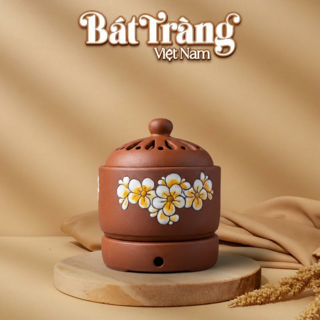 Trong dòng chảy của gốm sứ Bát Tràng, những sản phẩm gốm mộc luôn giữ một vị trí đặc biệt bởi sự giản dị nhưng đầy chiều sâu. Chiếc lư điện này được chế tác từ chất liệu gốm mộc cao cấp, giữ trọn vẹn màu nâu đất tự nhiên, mang lại cảm giác gần gũi, chân thật. Từng bông hoa sứ được vẽ nổi thủ công với sắc trắng tinh khôi và nhụy vàng rực rỡ, tạo nên một bức tranh nhiệt đới tươi tắn, thanh lịch, làm bừng sáng mọi góc nhỏ trong ngôi nhà.