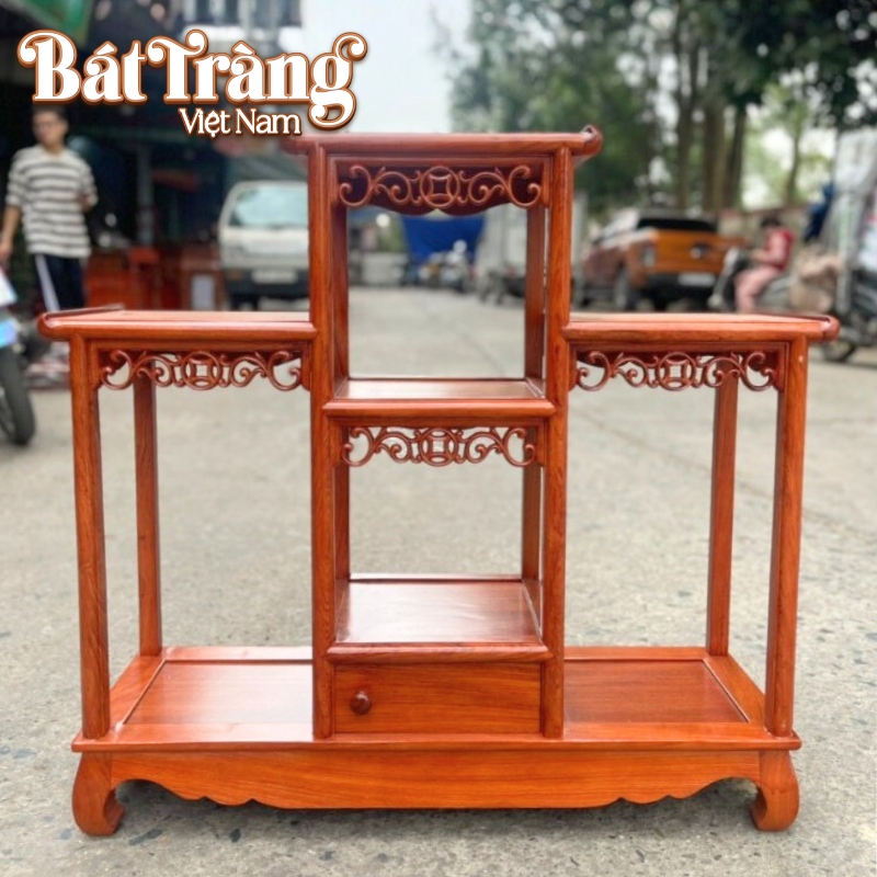Kệ trưng bày tam cấp chất liệu gỗ hương 80x84x26 BT-ĐG03 sở hữu thiết kế tam cấp cân xứng và vững chãi, mang đến một giải pháp bày trí trang nghiêm cho không gian phòng khách.