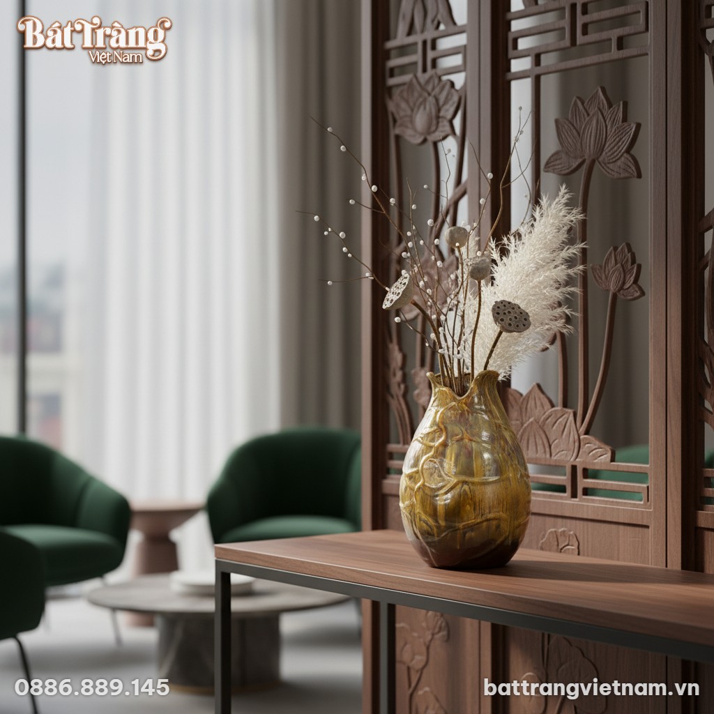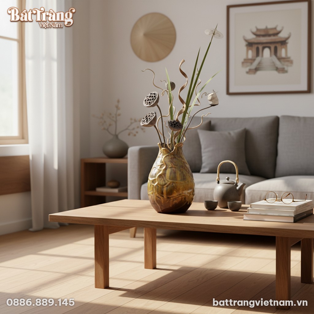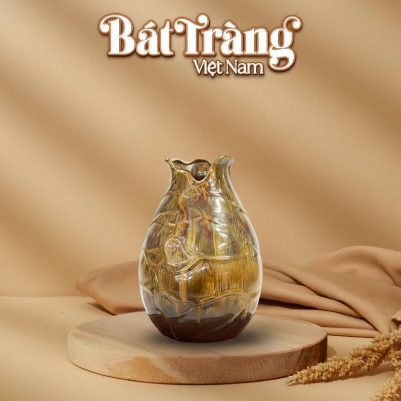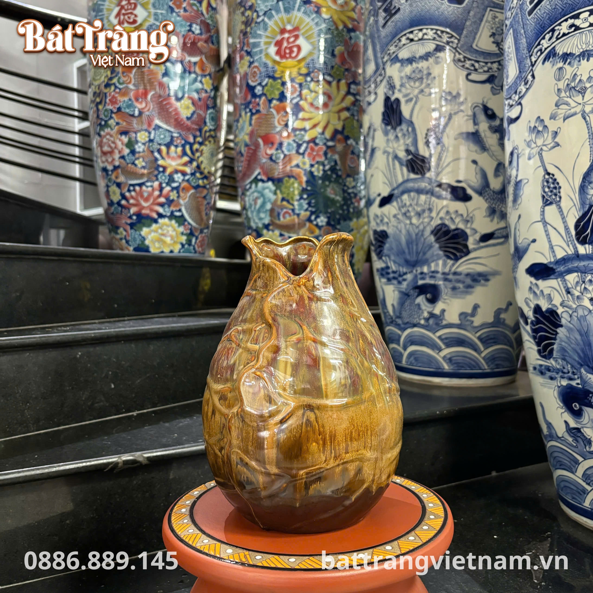 Lọ hoa búp sen men nâu hoả biến Bát Tràng BT-LHS16 là một biểu tượng của sự sáng tạo không ngừng nghỉ trong nghệ thuật gốm sứ. Không chỉ đơn thuần là một vật dụng để cắm hoa, sản phẩm này còn là một tác phẩm điêu khắc độc bản, nơi mỗi đường nét và vệt men chảy đều kể câu chuyện về sự giao thoa hài hòa giữa truyền thống và hơi thở đương đại.