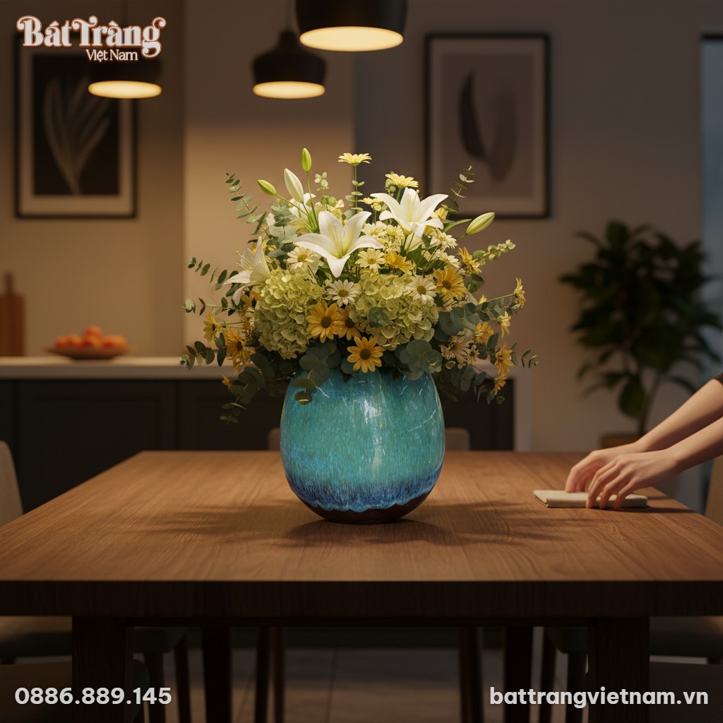 Bề mặt men bóng không chỉ tăng tính thẩm mỹ mà còn giúp việc vệ sinh trở nên dễ dàng, giữ cho chiếc lọ luôn sáng đẹp như mới theo thời gian. Đây là minh chứng cho chất lượng và sự tinh xảo trong từng sản phẩm của Gốm Bát Tràng Việt Nam.