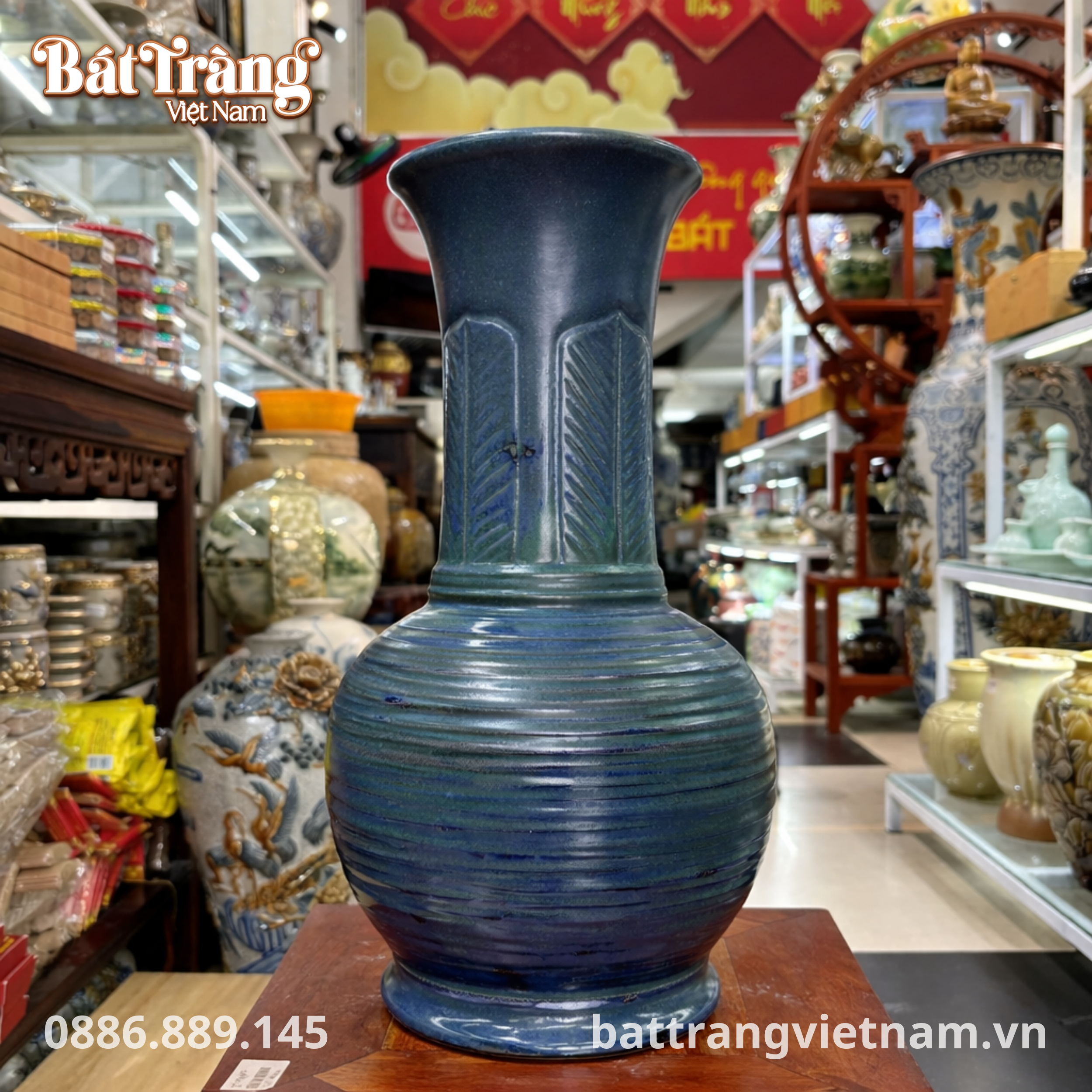 Điểm nhấn ấn tượng nhất của BT-LHS32 chính là nước men lam xanh đậm, một sắc thái vương giả và sâu lắng, thường thấy trong các dòng gốm sứ nghệ thuật của Bát Tràng. Đặc biệt, hiệu ứng chuyển sắc tự nhiên sang xanh lục ở các khe vân và họa tiết khắc nổi tạo nên chiều sâu và sự sống động hiếm có, biến mỗi chiếc lọ trở thành một tác phẩm nghệ thuật độc bản.