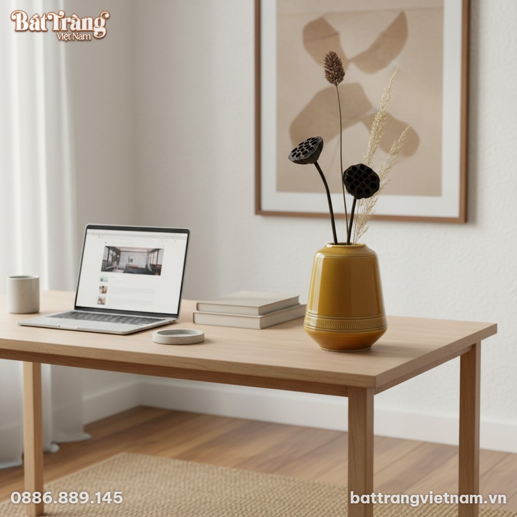 Chiếc lọ hoa BT-LHS42 sở hữu một sức hút khó cưỡng với nước men vàng mù tạt bóng, mang đến cảm giác ấm áp và sang trọng cho bất kỳ không gian nào. Đây là sắc thái men gợi nhớ về những giá trị hoài cổ nhưng lại hoàn toàn phù hợp với phong cách nội thất tối giản, hiện đại, tạo nên một điểm nhấn hài hòa, không phô trương.