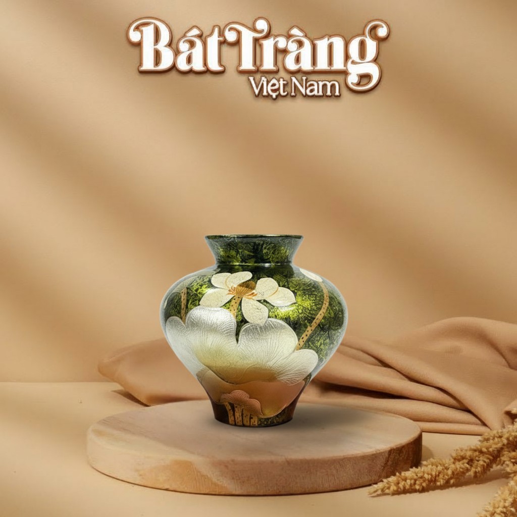 Chiếc lọ hoa này được chế tác từ chất liệu gốm sứ Bát Tràng cao cấp, đảm bảo độ bền vượt trội và an toàn cho người sử dụng. Kỹ thuật vẽ tay thủ công kết hợp men bóng đặc trưng tạo nên sự tương phản độc đáo giữa nền men xanh lá cây sẫm và họa tiết sen trắng kem, nâu đất. Sự kết hợp này không chỉ mang lại chiều sâu thị giác mà còn khẳng định giá trị nghệ thuật đích thực của sản phẩm
