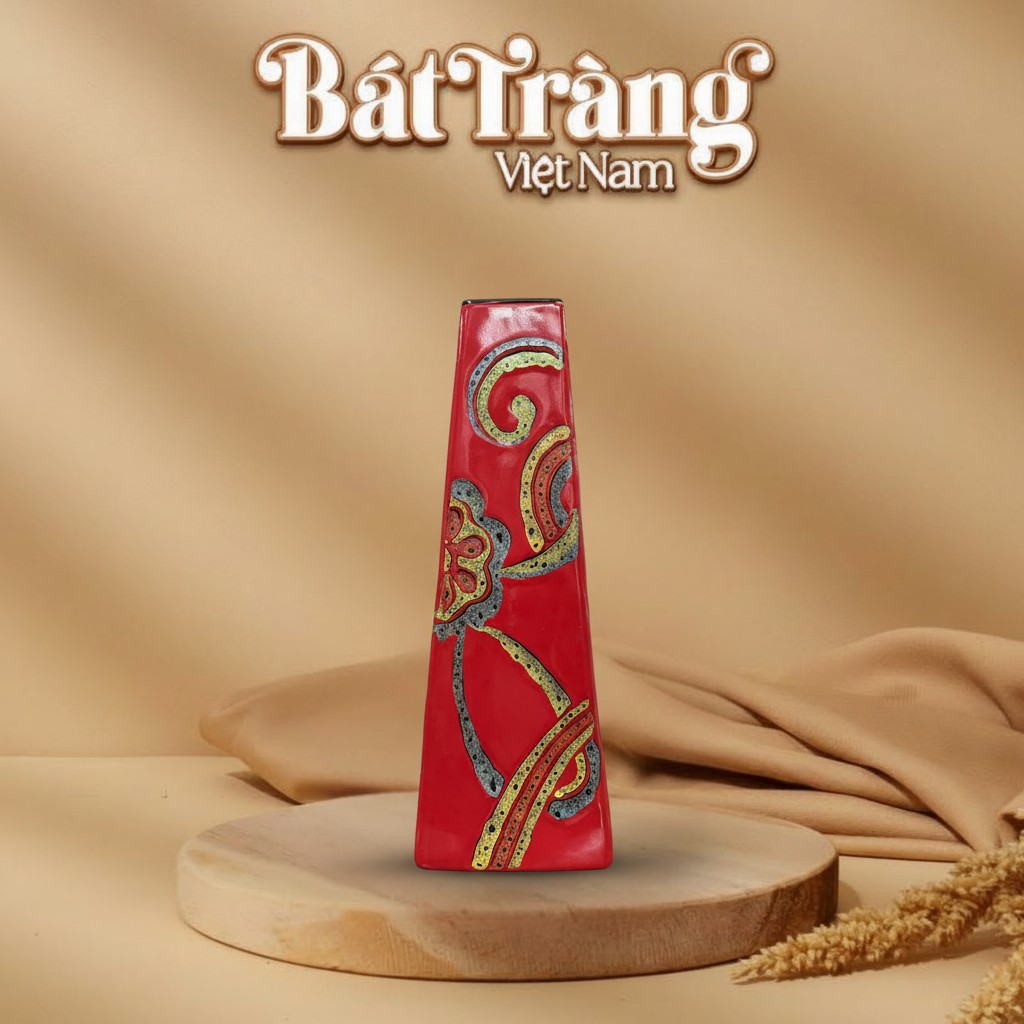 Nổi bật với dáng lọ tam giác thon dài, miệng loe nhẹ và thân thuôn dần về đáy, chiếc lọ BT-LGS25 thách thức mọi quy ước về hình dáng truyền thống. Kích thước cao 35cm x rộng 12cm lý tưởng để tạo điểm nhấn ấn tượng mà không chiếm quá nhiều diện tích. Bề mặt lọ được phủ lớp men bóng mịn màu đỏ chủ đạo, một gam màu của sự nhiệt huyết và may mắn.