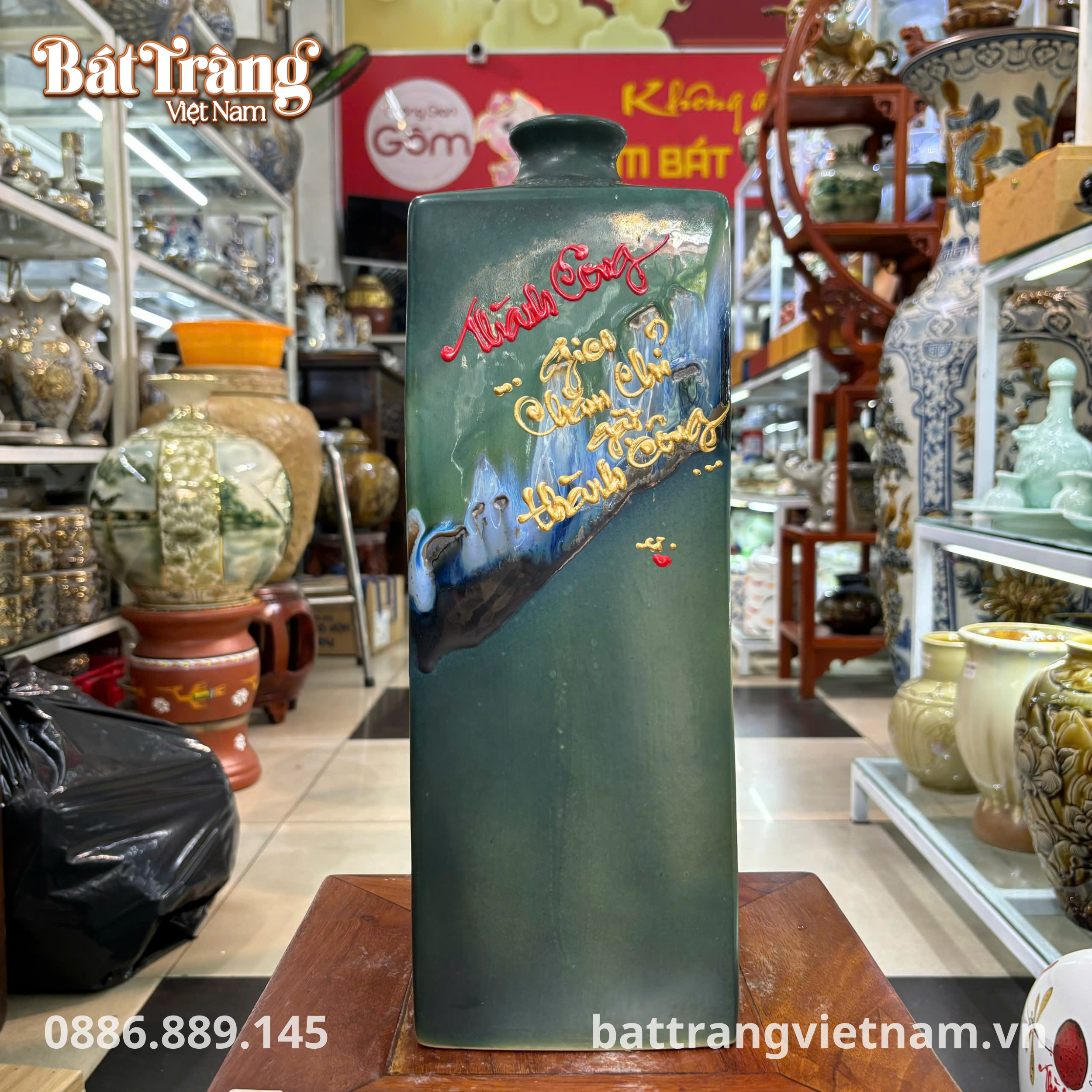 Lọ hoa dáng trụ vai vuông hoả biến chữ Thành Công BT-LHS30 là một tuyệt tác nghệ thuật đến từ làng nghề Gốm Bát Tràng Việt Nam, nơi hội tụ tinh hoa của gốm sứ truyền thống và sự sáng tạo không ngừng. Chiếc lọ này không chỉ là một vật phẩm trang trí đơn thuần mà còn là biểu tượng mạnh mẽ cho khát vọng vươn tới thành công, mang thông điệp ý nghĩa sâu sắc cho mọi không gian sống.