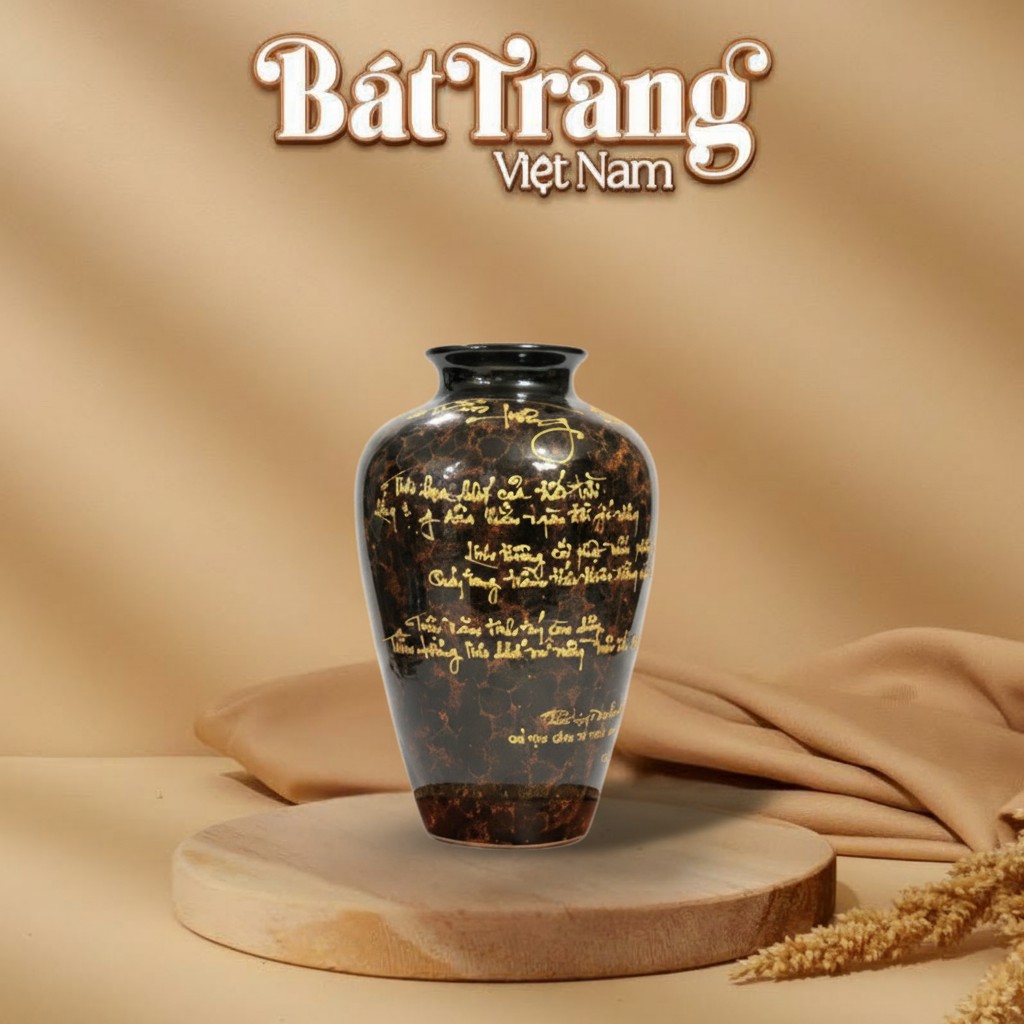 Với sự kết hợp độc đáo giữa men đen bóng, vân hỏa biến nâu vàng và những nét thư pháp vàng tinh xảo, chiếc lọ lục bình này xứng đáng là điểm nhấn sang trọng trong mọi không gian.