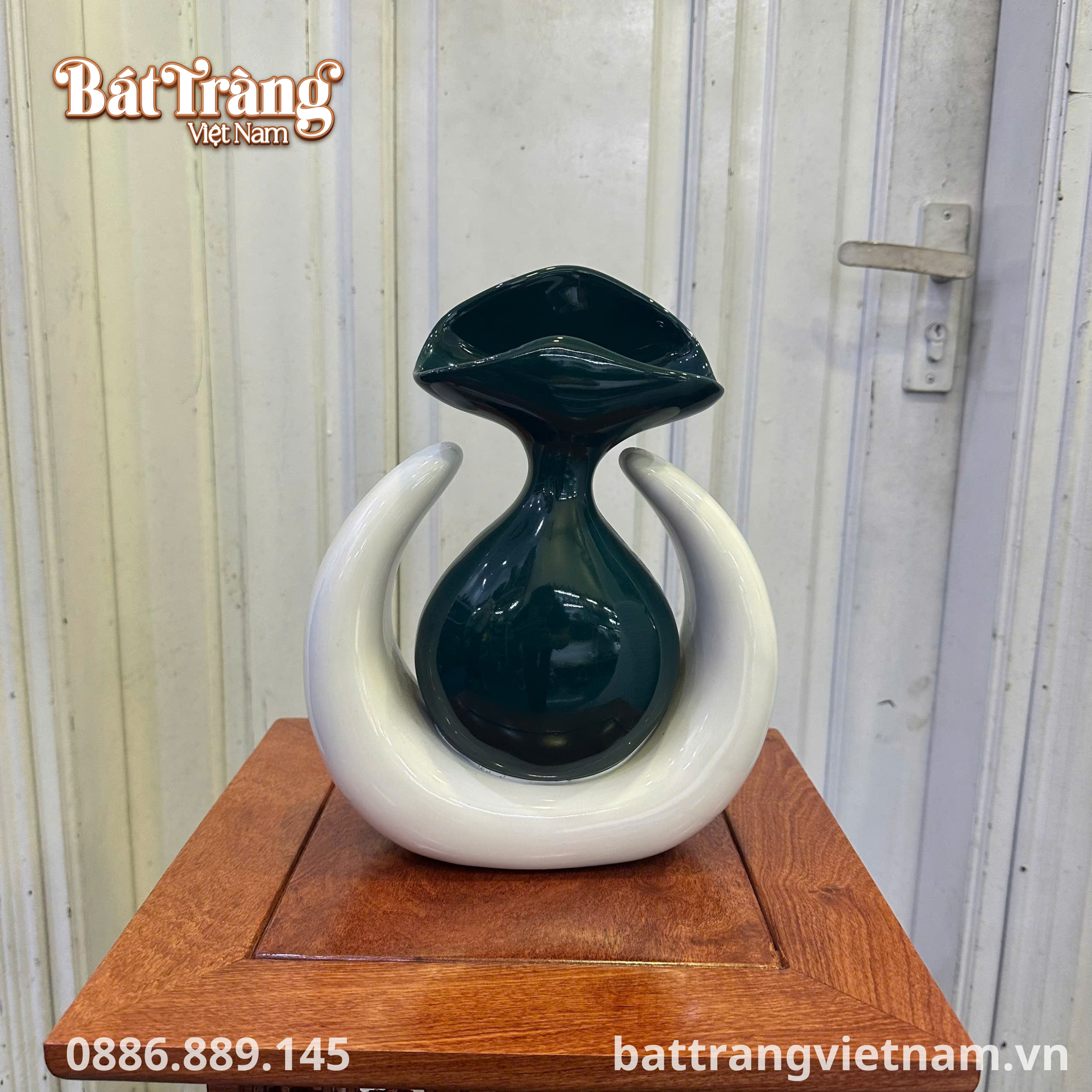 Điểm nhấn phá cách là đôi cánh trắng muốt uốn lượn mềm mại, ôm trọn lấy phần bình xanh. Những đường cong uyển chuyển này không chỉ tạo nên dáng vẻ cân đối, mà còn gửi gắm thông điệp về sự nâng đỡ, che chở và vươn lên không ngừng. Màu trắng tinh khôi đối lập hoàn hảo với màu xanh thẫm, tạo nên một tổng thể thị giác vừa mạnh mẽ, vừa thanh thoát, phù hợp với mọi không gian hiện đại.